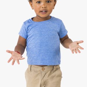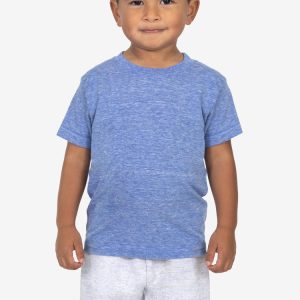 Our Tri-Blend Toddler T-Shirt. The polyester gives the garment shape and elasticity; the cotton adds comfort and durability; the rayon makes for a luxurious texture and is great for play. Durable rib neckband will last for years. Our experienced sewers earn up to $25 an hour and no less than $17.87; additionally worker