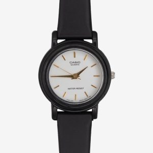 Ladies, on the go or just at home this casual classic says you know style. Ladies casual classic watch with a white watch face with gold colored markings for time The Classic Round watch from Casio exudes elegance and simplicity, for a chic everyday look. Its all-black design, including a durable black resin case, stai