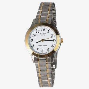 Designed for the timeless classic woman. Casio women’s watch features a sleek two-handed Japanese quartz movement, a mineral glass face, and a genuine leather strap. One of a kind gold-tone star accented sweeping hand. Water-resistant. These watches feature replaceable batteries, which can be conveniently swapped out a