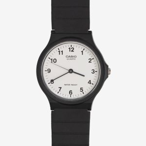 The basic black-and-white design of the Casio Men's Analog Watch makes it a simple, versatile timepiece great for everyday wear. The watch is constructed with a resin case, a black stationary resin bezel, and a black resin link bracelet with an adjustable buckle clasp. A durable mineral window protects the white dial f