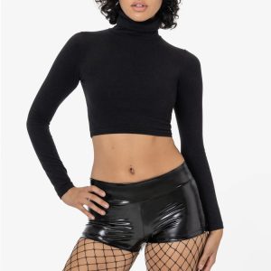 A super shiny mini short made from stretch vinyl that gives the appearance of latex with easier upkeep. These shorts have a low rise, banded waist and just enough coverage. Made in Los Angeles, Calif. Our experienced sewers earn up to $25 an hour and no less than $17.87; additionally workers have healthcare benefits fo