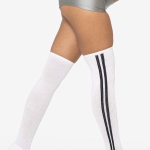 This athletic, girly soccer sock features 2 contrasting vertical stripes down the outseam of each leg. Sits at a flattering length above the knee at the lower thigh. Pair with hot shorts and show them off. Best fits women's shoe sizes 7-10. * All sales final. No returns or exchanges allowed. • Made in Los…