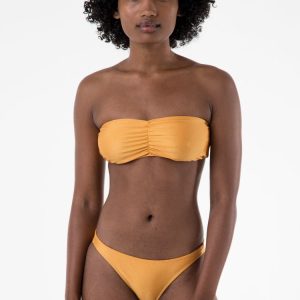 A basic bandeau bikini top with ruching down the center. Fully lined with material suitable for wear in water. Our experienced sewers earn up to $25 an hour and no less than $17.87; additionally workers have healthcare benefits for less than $15 per week, a 401k plan, paid sick days, subsidized bus passes and favorable