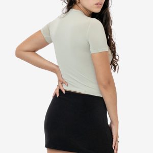 This seamless nylon/spandex baby tee features a mid-length fit, high crew neckline and short sleeves. An everyday sportswear-inspired basic with a super smooth finish and generous stretch for extreme comfort. Try layering this piece with oversized sweatpants and a matching zip up hoodie. Made in Los Angeles, Calif. by