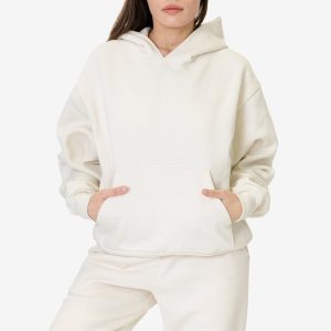 Our new mid-weight, 2-end fleece is made of a 50/50 blend of poly cotton and has a tight knit with minimal stretch. This 10 oz. fleece is an easy, versatile year-round textile. This oversized hoodie has a wide, voluminous fit and features a kangaroo pocket and matching rib cuffs and waistband. This mid-weight fleece is