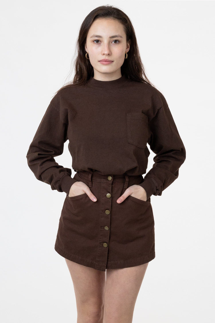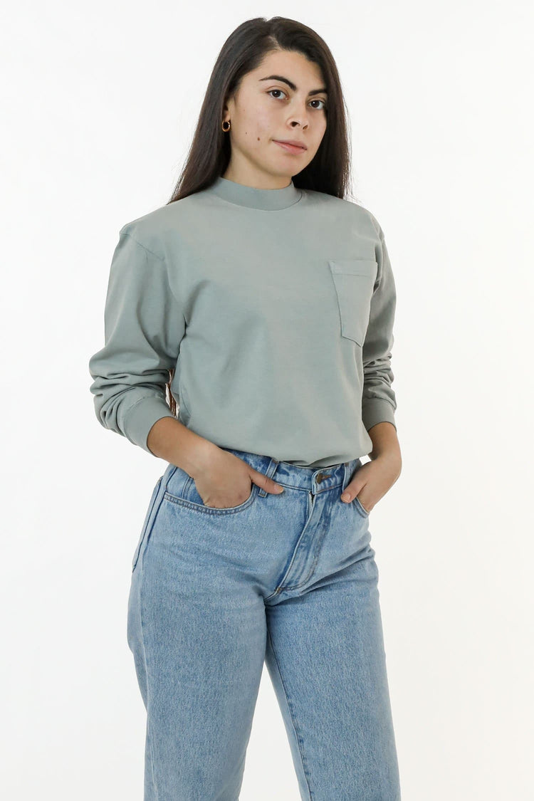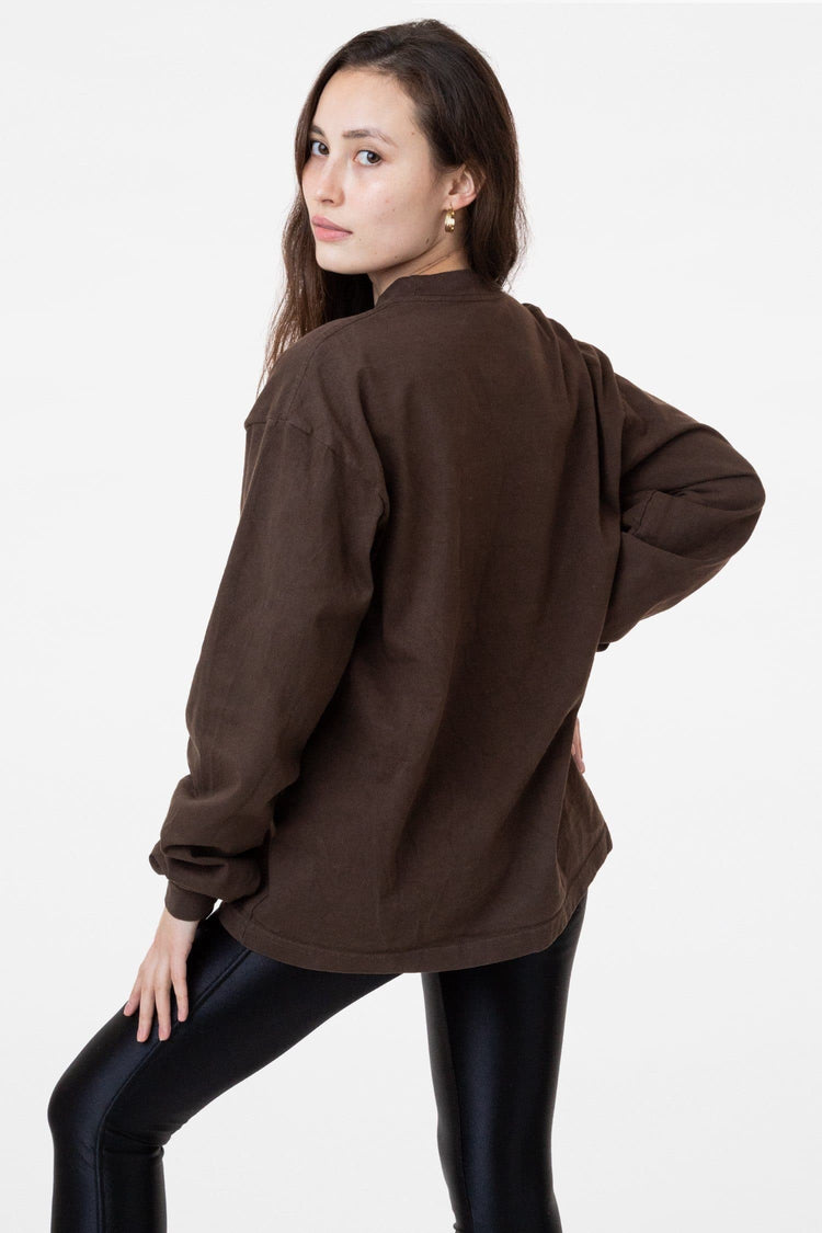 This unisex work shirt is made of our super heavy 8.5 oz., 12 singles jersey which features more structure than a more lightweight jersey. This workwear-inspired shirt features extra room in the sleeves and body width so it can be layered with your favorite undershirts, a round mock neck collar, and a pocket to keep an