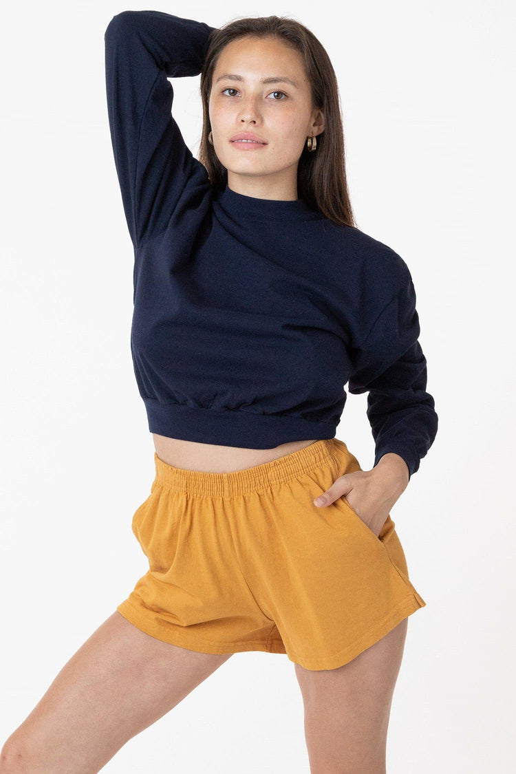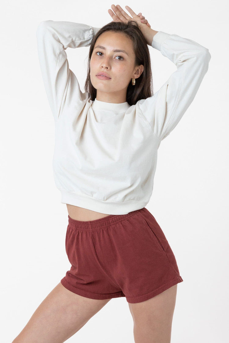 A feminine take on our Unisex Gym short. Perfect Short Shorts for the gym or your Sunday morning at home. These shorts are part of our garment dye line, which is always custom dyed, shrink-free and sewn with 100% USA-grown cotton. Made in Los Angeles, Calif. Our experienced sewers earn up to $25 an hour and no less tha