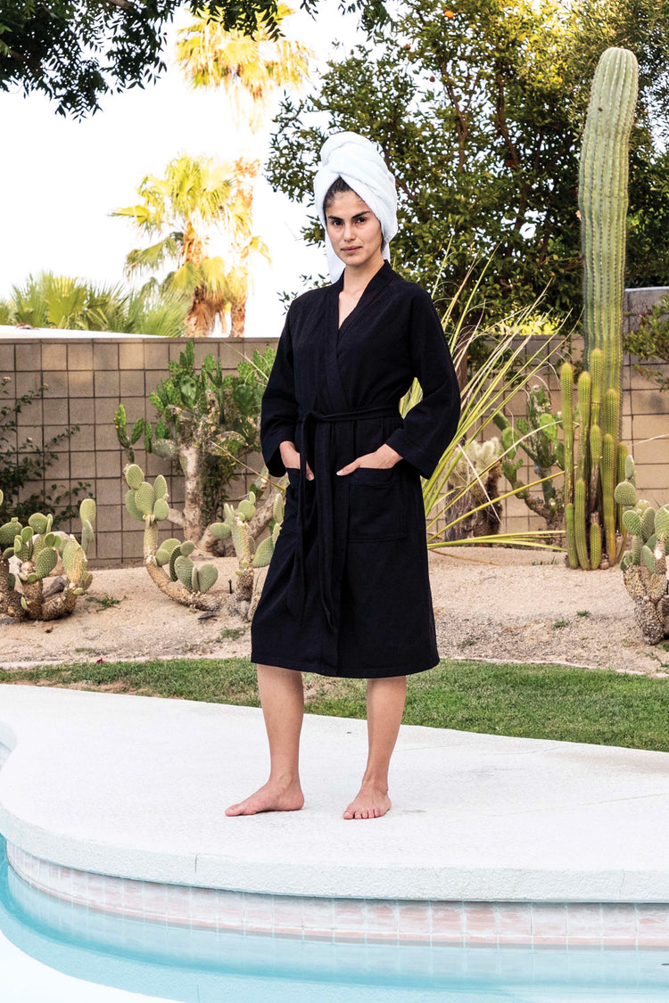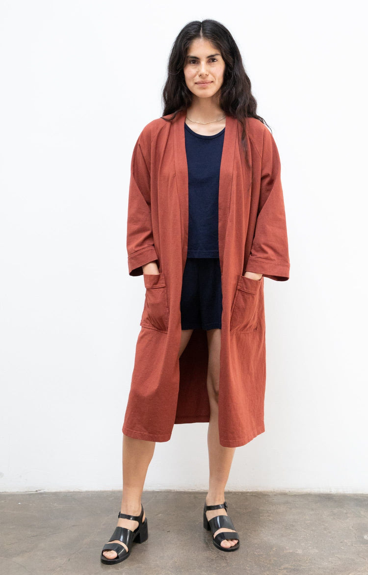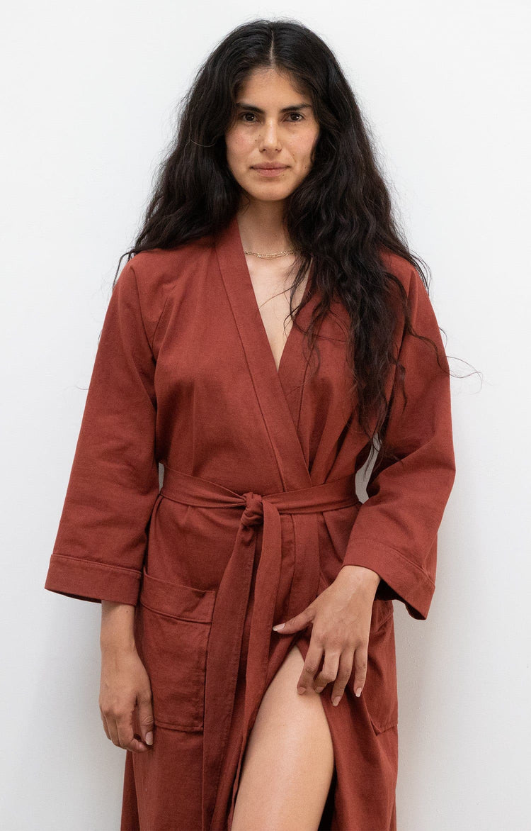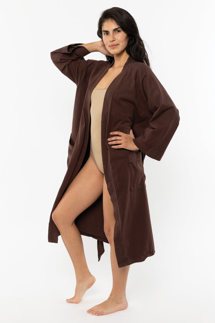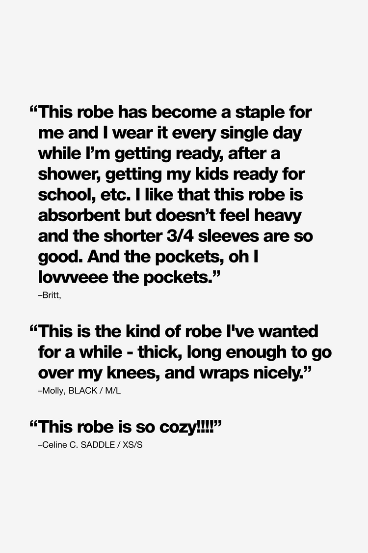 Our House Robe is made of 100% cotton and can be worn in and out of the house. Made of heavy jersey, it'll be your new staple after a bath, as a poolside coverup, and for a casually chic look at home or while you're out running errands. Features 3/4 raglan sleeves, 2 front pockets, and a waistband that's attached to th