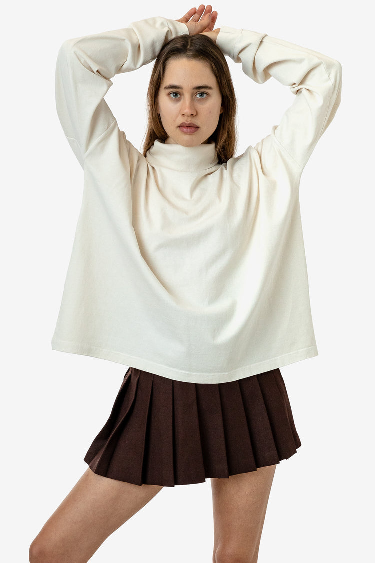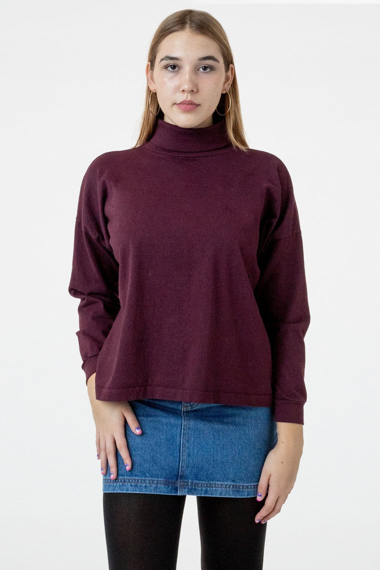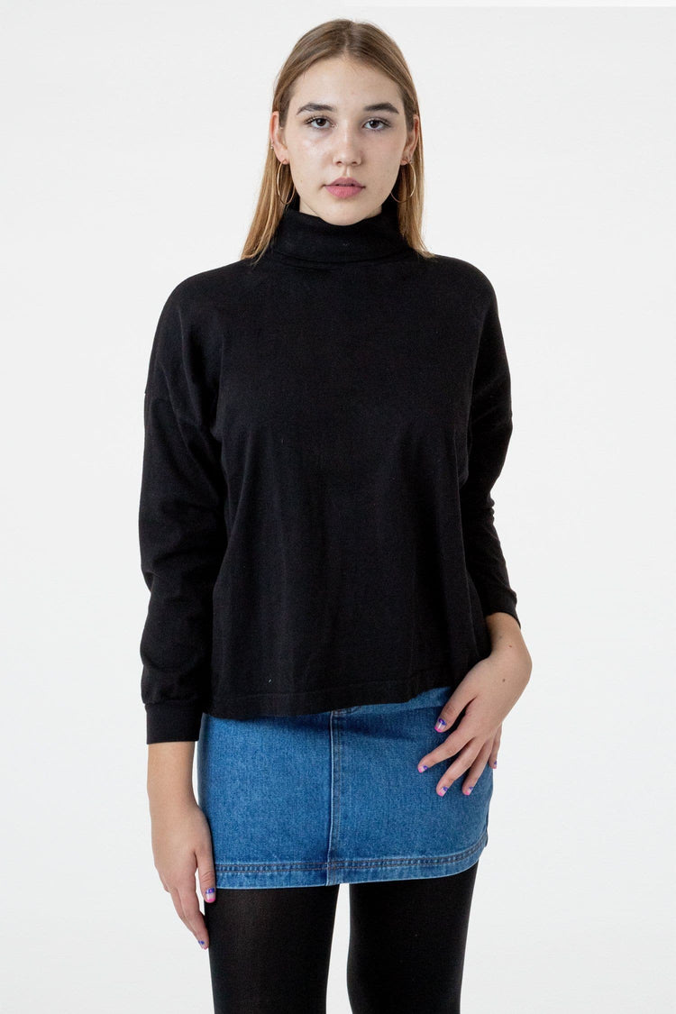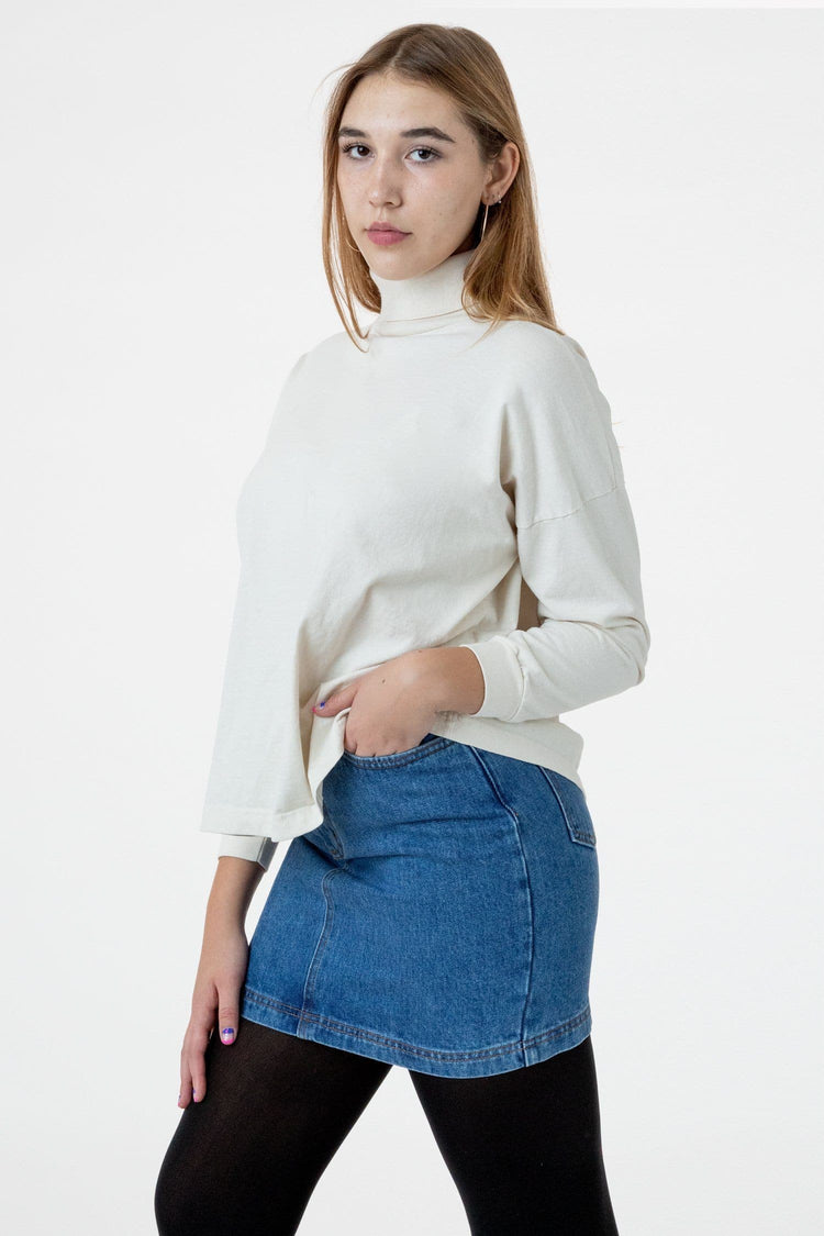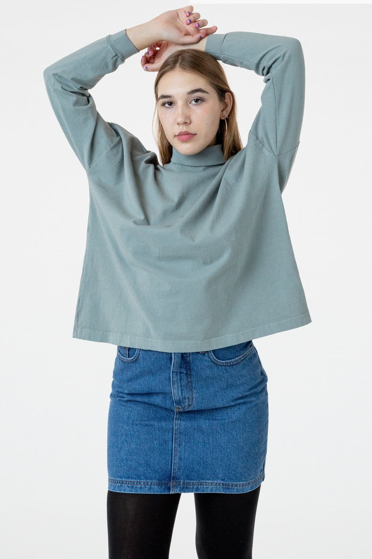 A boxy, mid-length version of our garment dye turtleneck for women made of slightly heavier 14 singles cotton. This style features drop shoulders and cropped sleeves with 1.5" cuffs. This piece pairs well with jeans & high-waisted skirts and can be worn tucked or untucked. This turtleneck is part of our garment dye