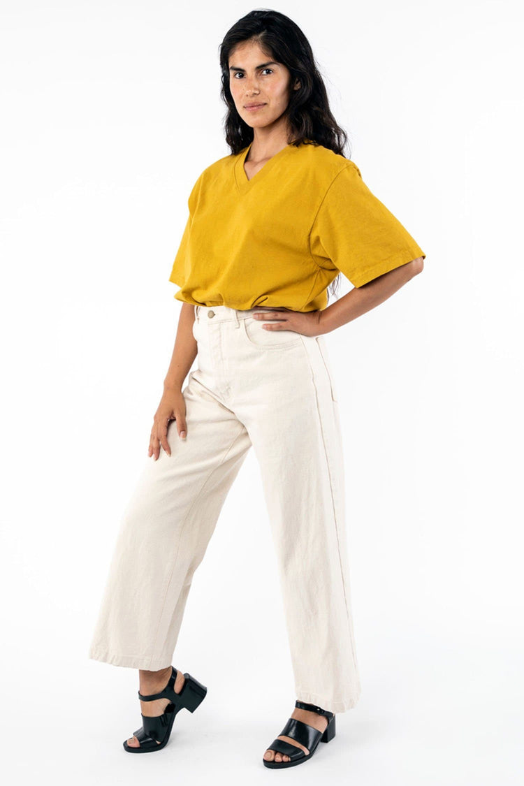 Constructed out of 14/1 cotton jersey, the Boxy V Neck T-Shirt features an alternative silhouette for women in comparison to our crewneck T-shirts, with a neckline that emphasizes facial features and slightly structured sleeves for strong shoulders. The fabric has a heavier feel than the 1801GD as it is knit using a th