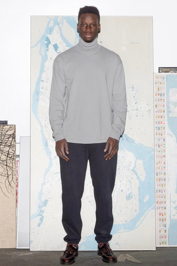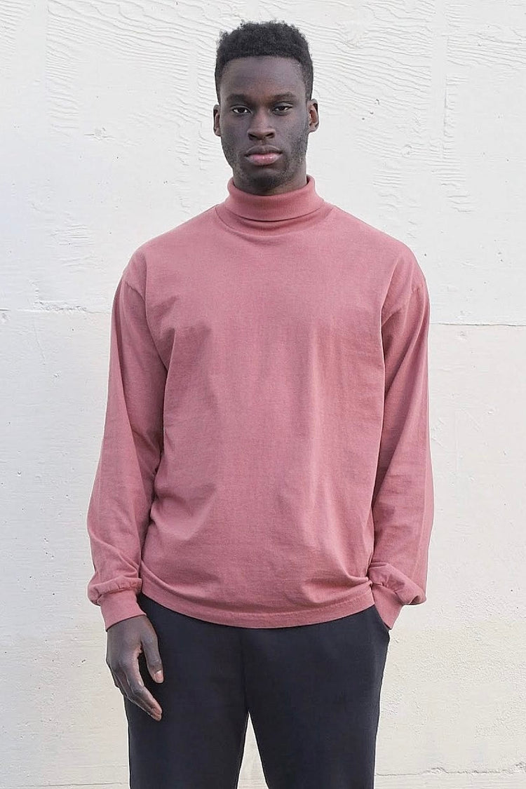 A classic layering piece, reinvented with a dropped shoulder fit. This Turtleneck Tee is part of our garment dyed line, which is always custom dyed, shrink-free and sewn with 100% USA-grown cotton. Our experienced sewers earn up to $25 an hour and no less than $17.87; additionally workers have healthcare benefits for l