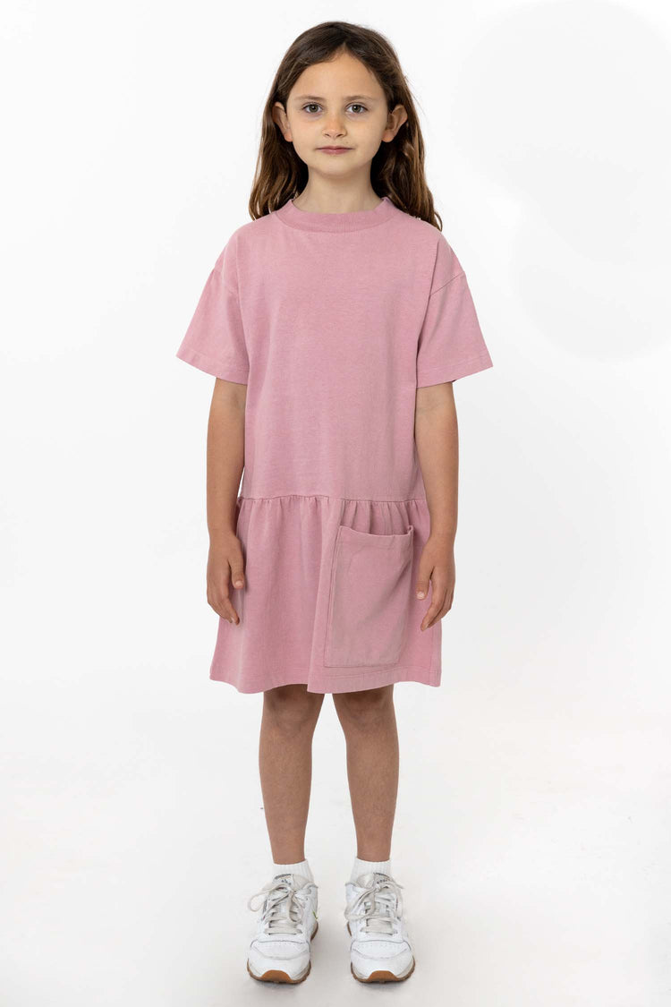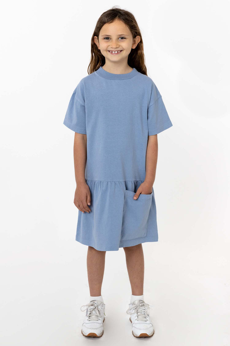 Our Kids Heavy Jersey Dress will be your child's summer staple. Our design mixes the comfort of a t-shirt with a flowing skirted end, featuring a boxy fit that is great for play and a front pocket that will fit your everyday essentials. Ideal for summer adventures, just throw this dress on and go! Made in Los Angeles,