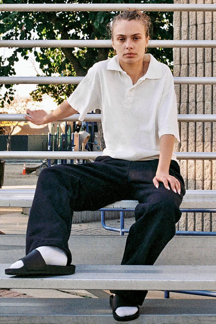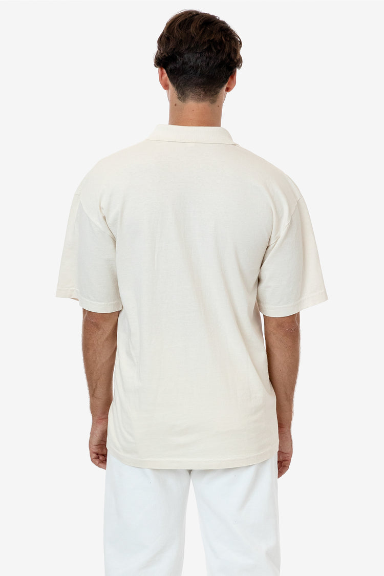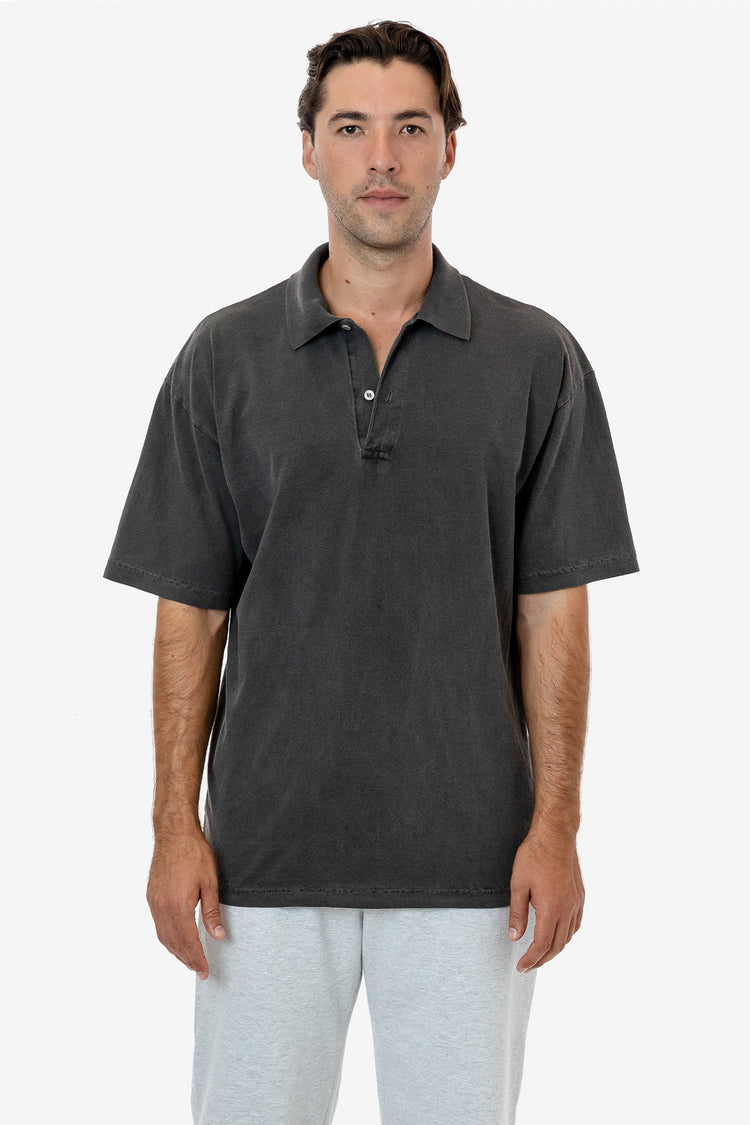 Our 18/1 short sleeve polo is made of our 6.5 oz. cotton jersey for everyday versatility. With the same generous fit and dropped shoulder as our iconic 1801GD Garment Dye T-shirt, this collared take is finished with a 2-button placket for a casual feel. This polo is shrink-free as a result of garment dyeing and has a n