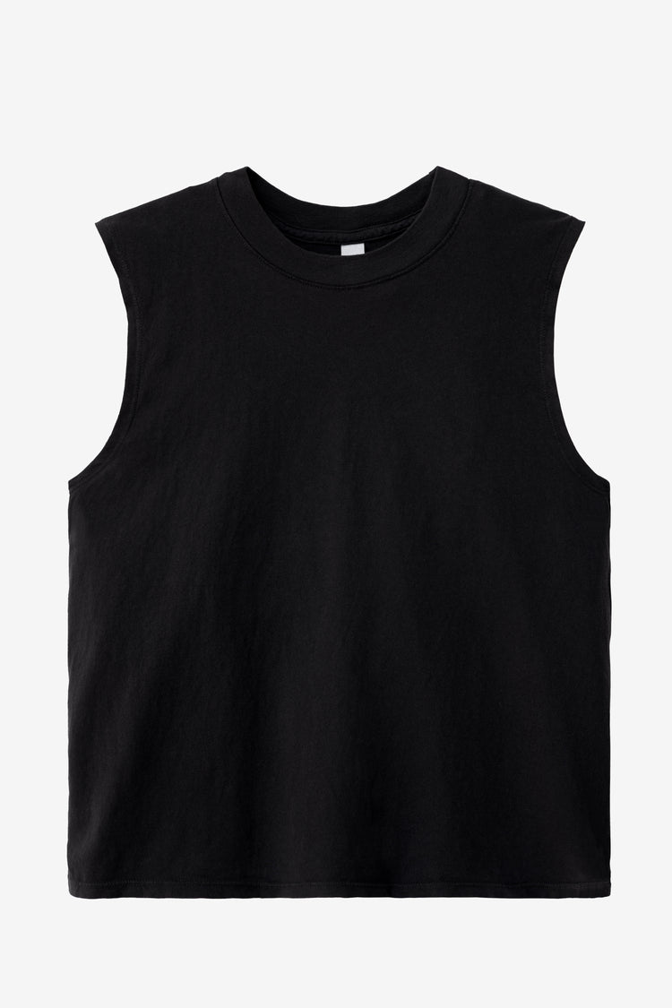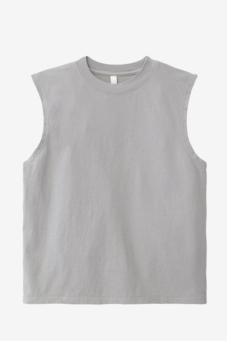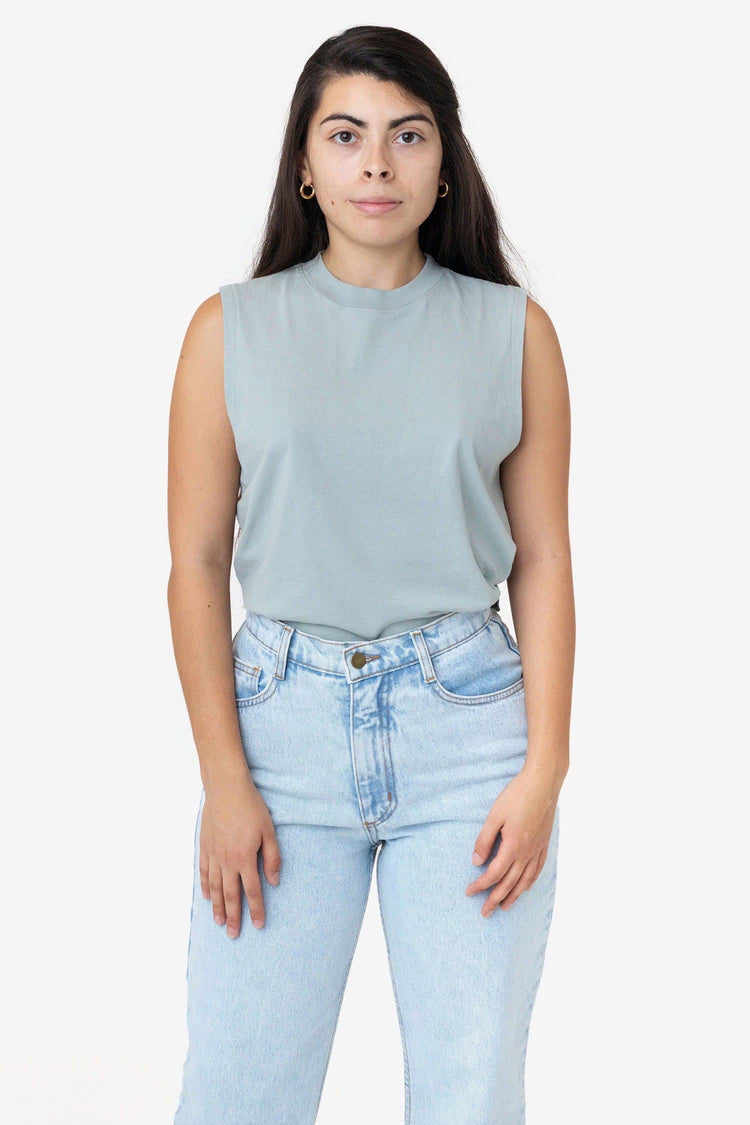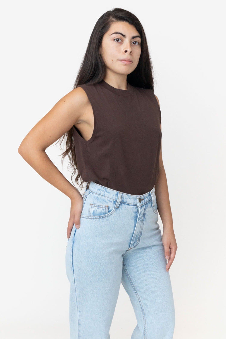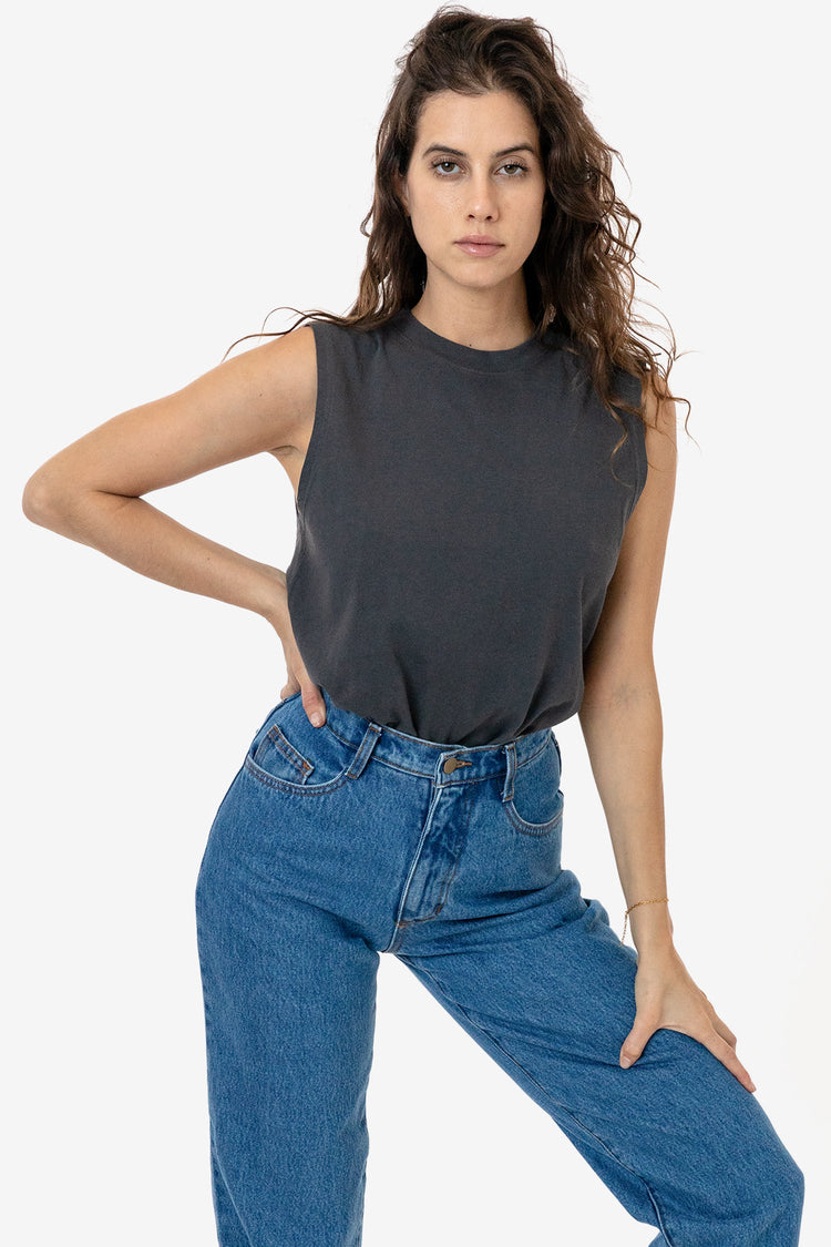 Our Women's Muscle Tank is made of a lightweight and airy 28/1 open end yarn like our 2802GD Boyfriend Tee. This style has a generous fit with roomy armholes. The high-crew neckline of this top makes it great for layering and the mid-length can be tucked in or worn out. Made in Los Angeles, Calif. Our experienced sewer