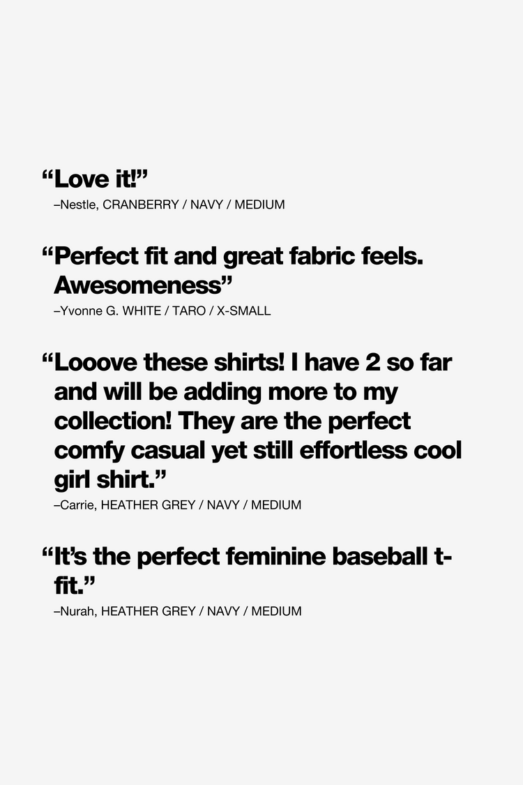 This full length baby tee features contrasting raglan sleeves and a thin binding finish around the neck. Features slightly cropped sleeves for a flattering look. Mix and match with any of our running shorts or pair with jeans, sweats and more. Runs true to size– but feel free to size down for a tighter fit. Our combed