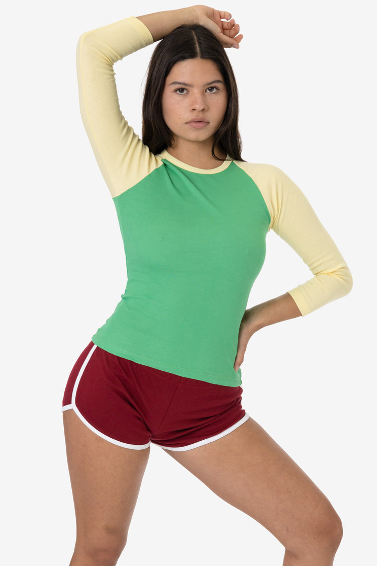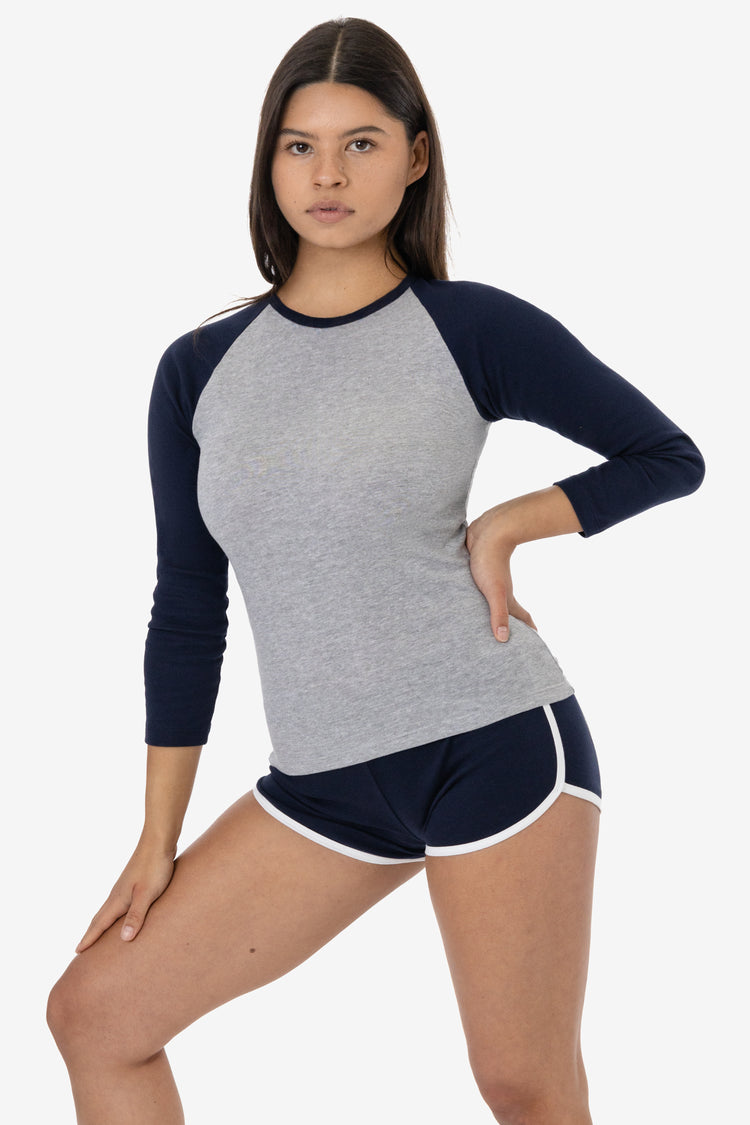This full length baby tee features contrasting raglan sleeves and a thin binding finish around the neck. Features slightly cropped sleeves for a flattering look. Mix and match with any of our running shorts or pair with jeans, sweats and more. Runs true to size– but feel free to size down for a tighter fit. Our combed