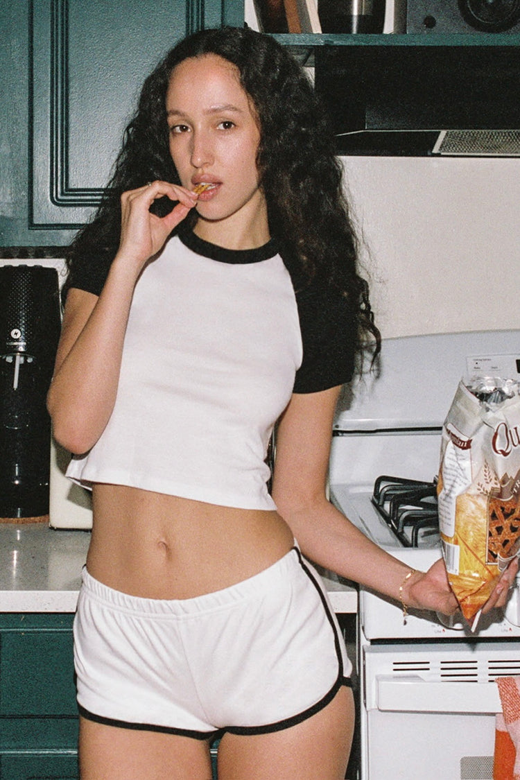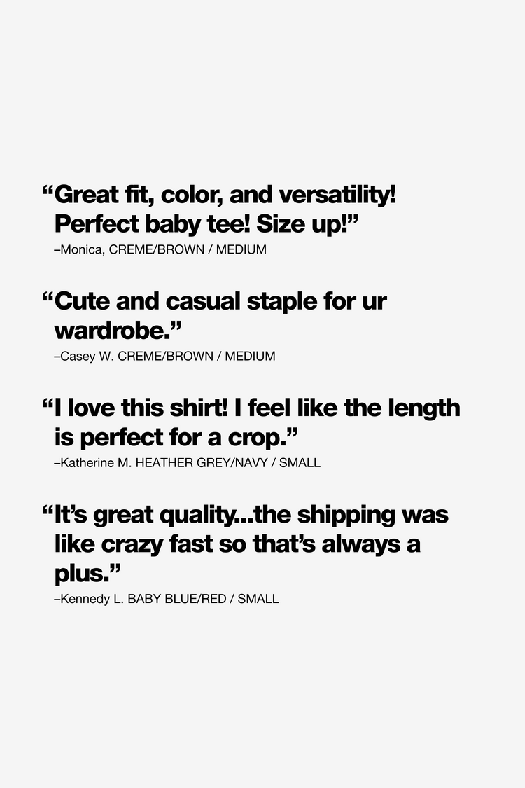 A cropped baby tee with contrasting raglan sleeves and a 3/4" binding finish. Our combed cotton baby rib is made of soft 30 singles yarn and stretches up to 2 times its original size. This 100% cotton style shrinks 7% in wash and this style has been designed to fit before and after wash. Our experienced sewers earn up