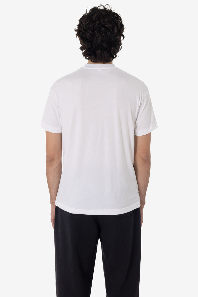 A lightweight combed cotton jersey t-shirt designed in the 2008 era. This tee is form-fitting yet flexible to the wearer's body and is laundered for a shrink-free experience. Made in Los Angeles, Calif. Our experienced sewers earn up to $25 an hour and no less than $17.87; additionally workers have healthcare benefits