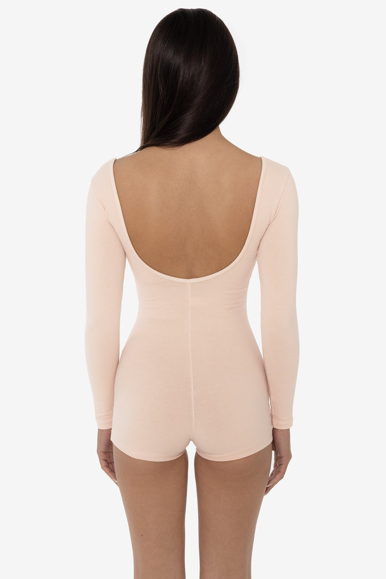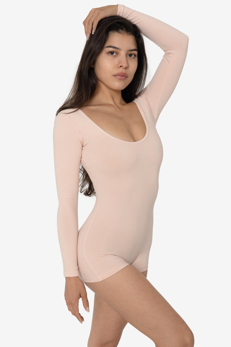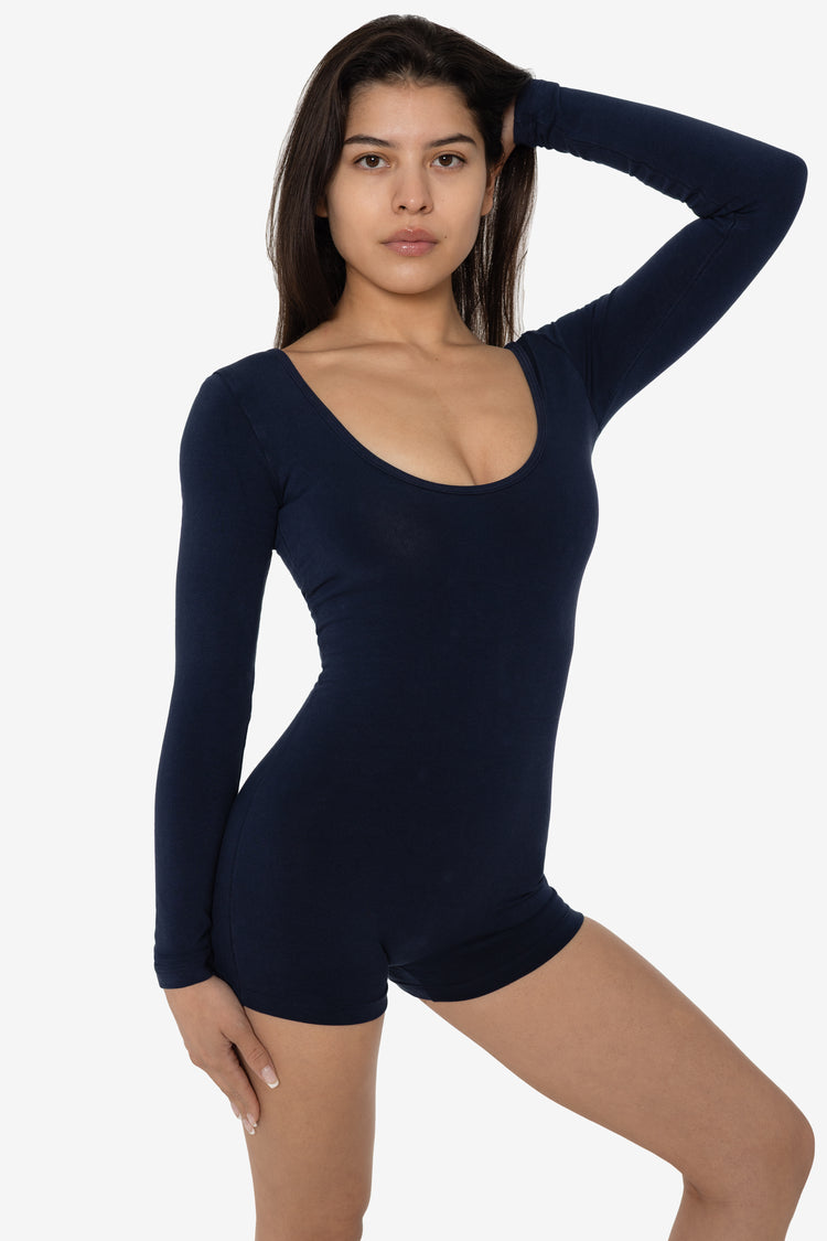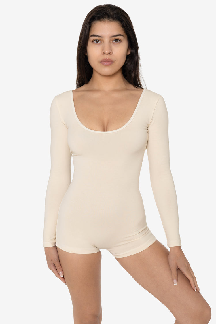 The Garment Dye Long Sleeve Short Biketard is made for movement. This simple one piece features long sleeves and a classic scoop neck with scoop back. Wear this fitted style alone for a flattering look that showcases your body or layer with jeans or sweats. This unitard is made of a heavyweight cotton spandex with extr