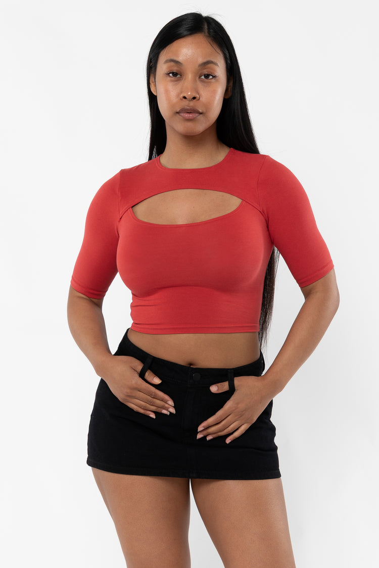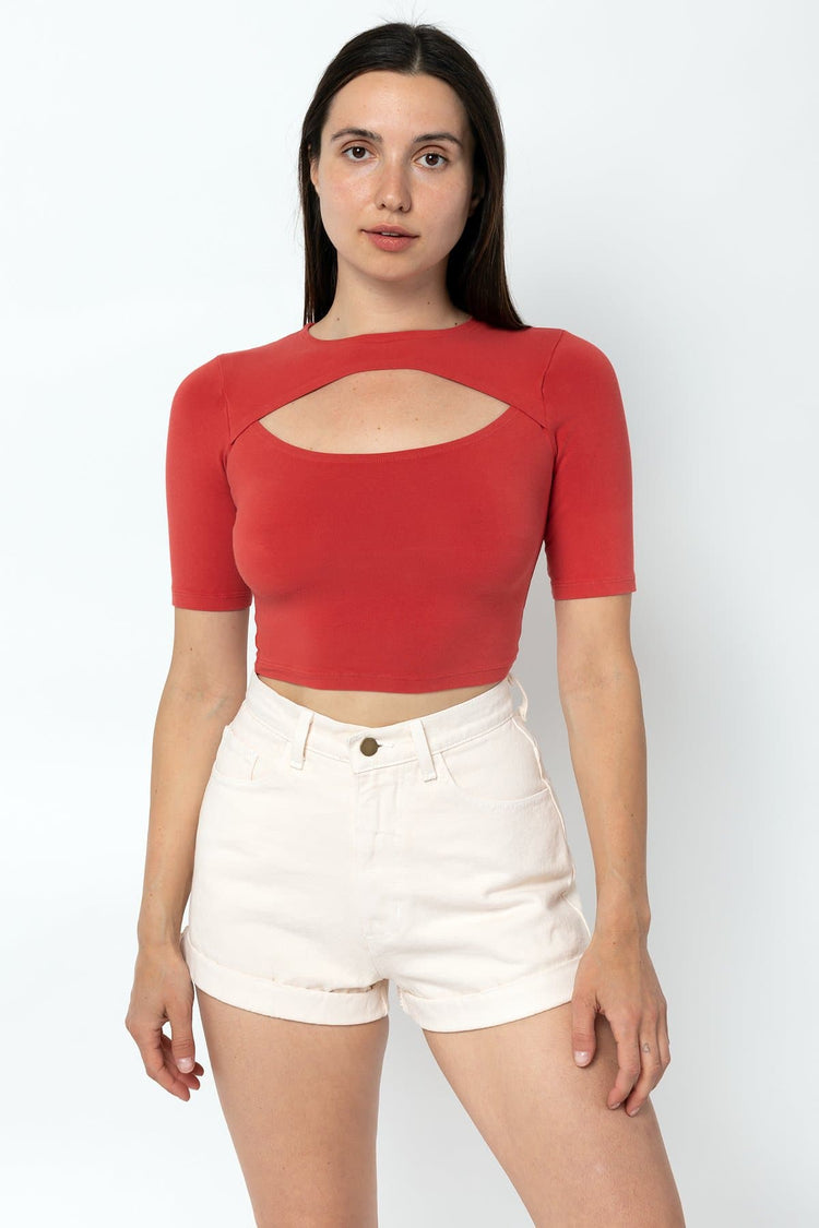 This style is a variation of the basic crop top and features a cutout on the chest and slightly longer sleeves. Made in Los Angeles, Calif. Our experienced sewers earn up to $25 an hour and no less than $17.87; additionally workers have healthcare benefits for less than $15 per week, a 401k plan, paid sick days, subsid