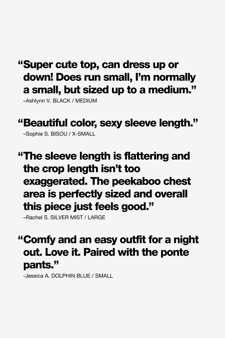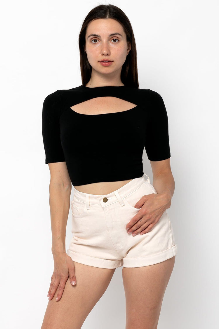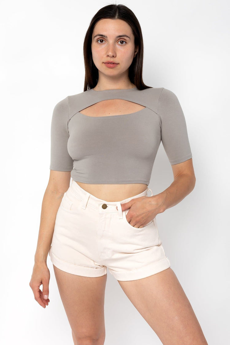 This style is a variation of the basic crop top and features a cutout on the chest and slightly longer sleeves. Made in Los Angeles, Calif. Our experienced sewers earn up to $25 an hour and no less than $17.87; additionally workers have healthcare benefits for less than $15 per week, a 401k plan, paid sick days, subsid