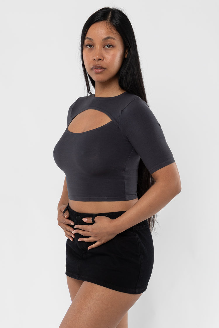 This style is a variation of the basic crop top and features a cutout on the chest and slightly longer sleeves. Made in Los Angeles, Calif. Our experienced sewers earn up to $25 an hour and no less than $17.87; additionally workers have healthcare benefits for less than $15 per week, a 401k plan, paid sick days, subsid