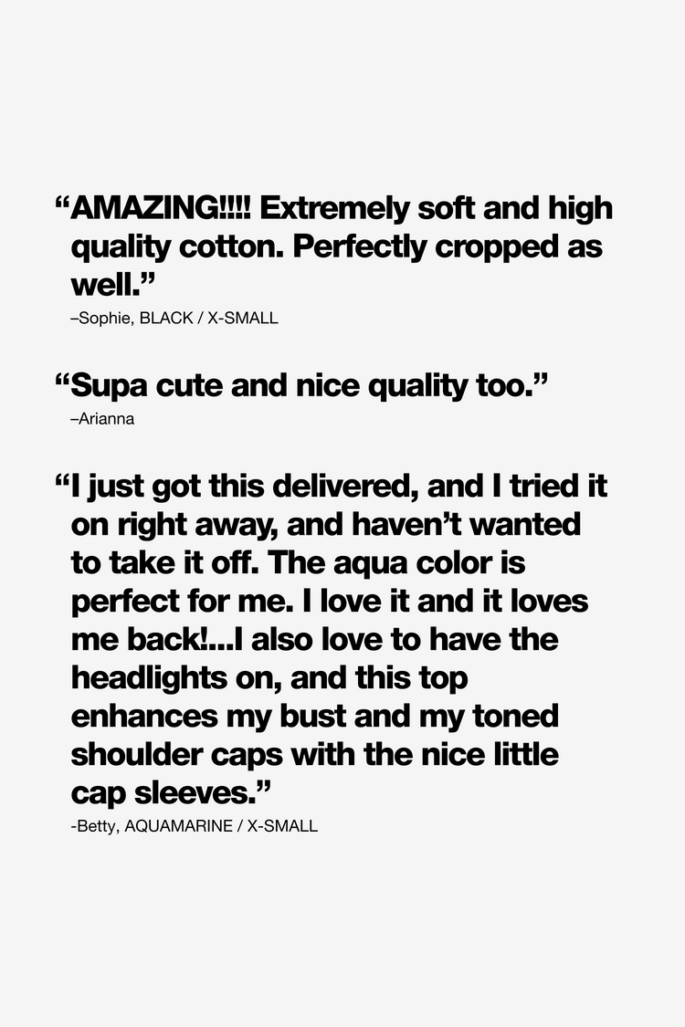 This tiny baby tee has a shrunken-in look with a super cropped length and small capped sleeves. The mid-scoop neckline reveals just the right amount of skin to balance out the shorter crop. Pair with any of our sweats and or yoga leggings for a casual look or pair this piece with our cotton spandex bottoms to create a