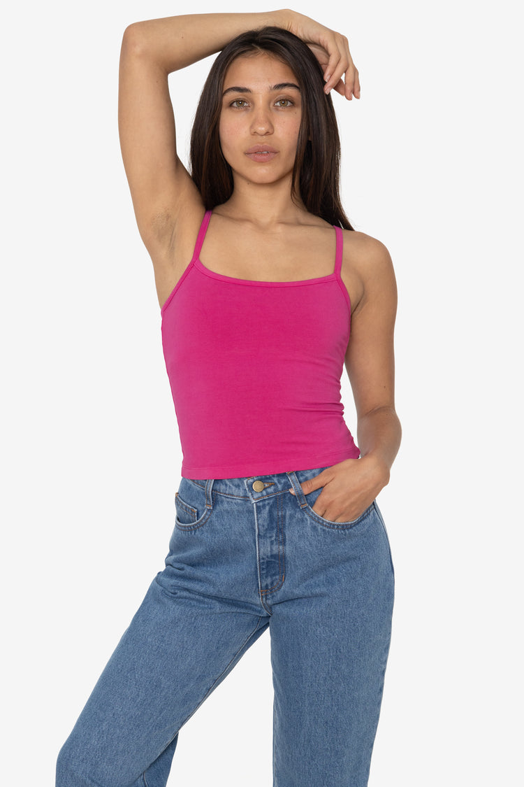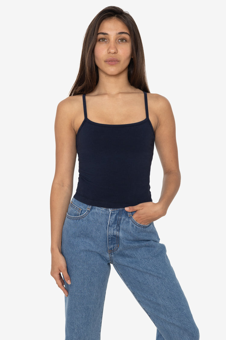 This essential camisole is made of our premium, heavyweight cotton spandex jersey and features an internal shelf bra lining for extra bust support and a smooth fit. This tank features thin spaghetti straps, a medium-length and is slightly flared at the bottom for a slinky silhouette that emphasizes the waist. Pair with