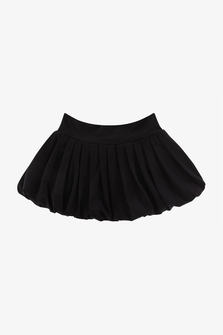 This pleated bubble skirt can be worn mid to low rise on the hips. The pleating provides just enough volume for flirty appeal. Our experienced sewers earn up to $25 an hour and no less than $17.87; additionally workers have healthcare benefits for less than $15 per week, a 401k plan, paid sick days, subsidized bus pass