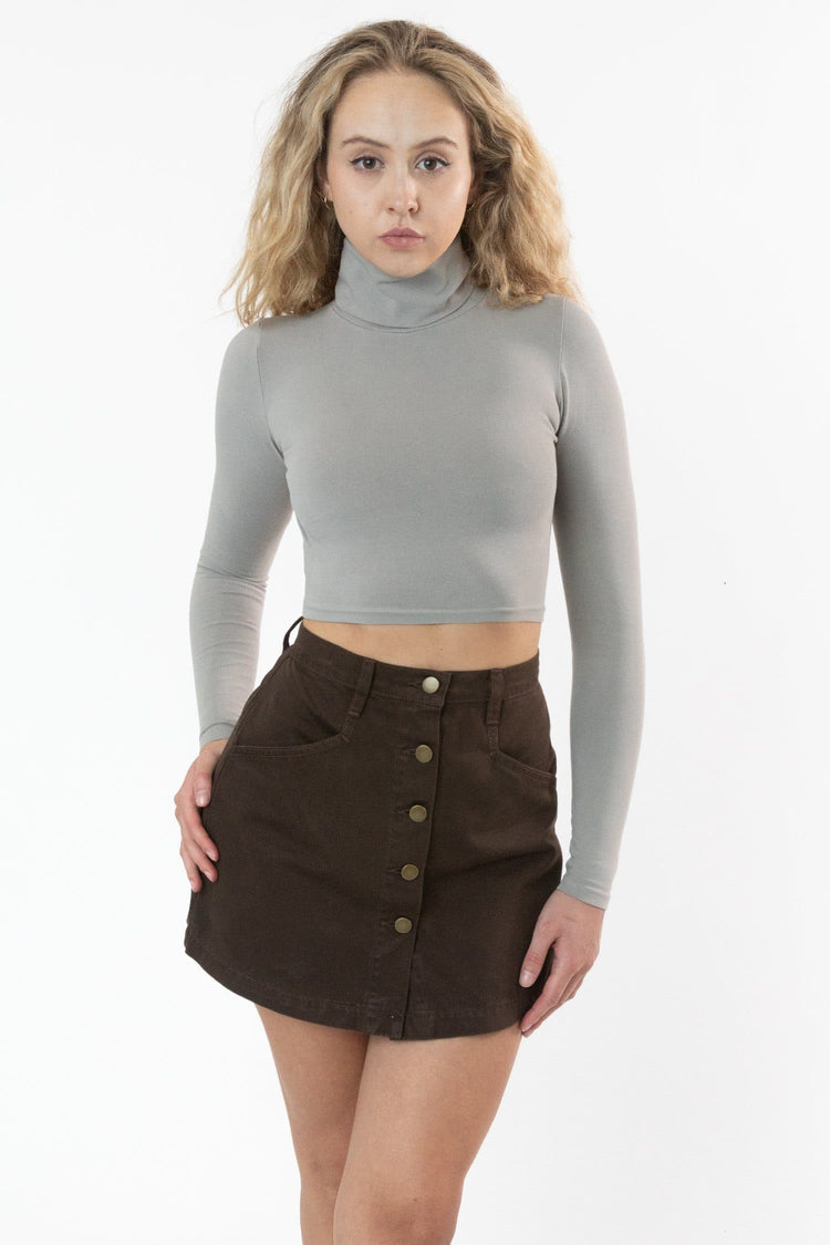 Our classic turtleneck now available in a cropped fit in our favorite neutrals and statement bright colors to match our garment dye collection. This tight, fitted turtleneck made of high quality cotton spandex with a full fold-over turtleneck to keep you warm all season long. This top features a cropped length that can