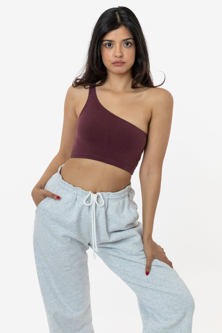 The Garment Dye One Shoulder Crop Top is a wardrobe staple in between a bralette and a crop top. Featuring a super cropped length and looks great underneath an oversized jacket with any style of bottoms, from sweatpants in the daytime or a fitted pant at night. This style is made of a premium cotton spandex with extra