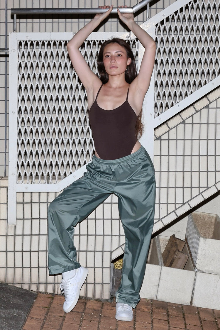 A classic spaghetti strap bodysuit with a low cut neckline and scoop back for a flattering, yet basic staple for any outfit. This bodysuit has super high leg openings for comfort under high waisted bottoms and a thong back. Made of a heavyweight cotton spandex with extra compression and as been garment dyed and enzyme