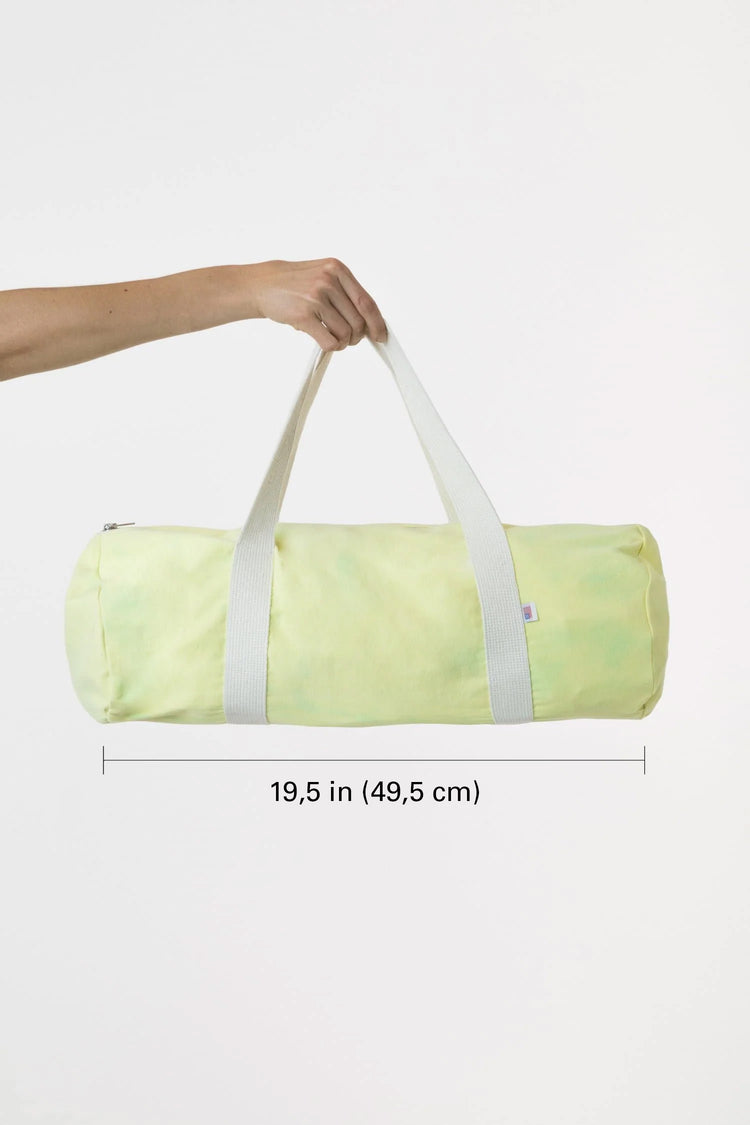 A fun gym bag ideal for summer trips to the beach, yoga classes and picnics in the park available in subtle-yet-vibrant, tie-dyed canvas. This canvas bag is machine washable and features contrasting natural woven straps. This bag has a height of 8.5" and bottom width of 19.5" with versatile nylon webbing straps that fi