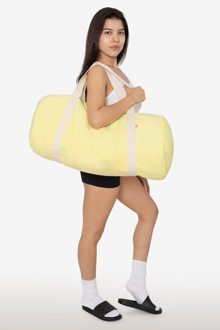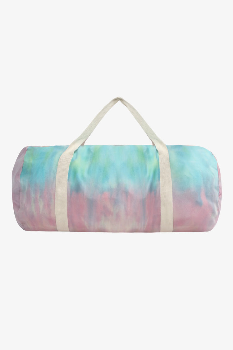 A fun duffel bag ideal for summer trips to the beach, yoga classes and picnics in the park available in subtle-yet-vibrant, tie-dyed canvas. This canvas bag is machine washable and features contrasting natural woven straps. This bag has a height of 13 1/2" and bottom width of 40" with versatile nylon webbing straps tha