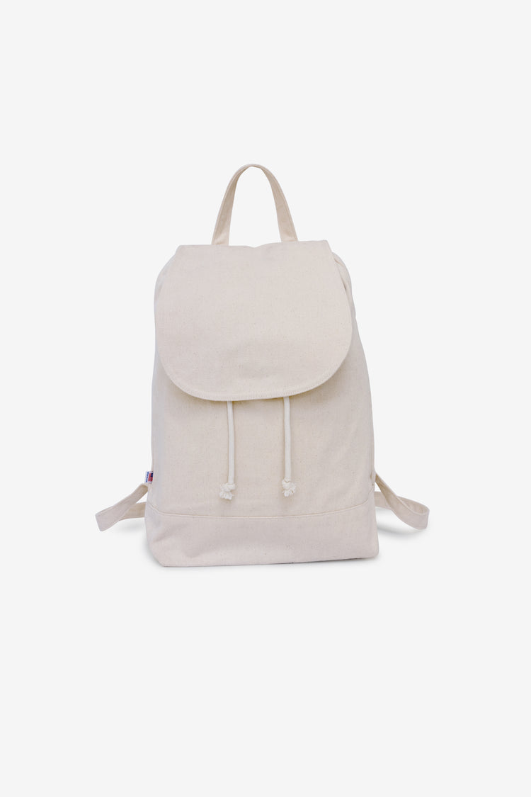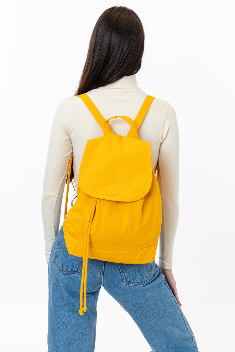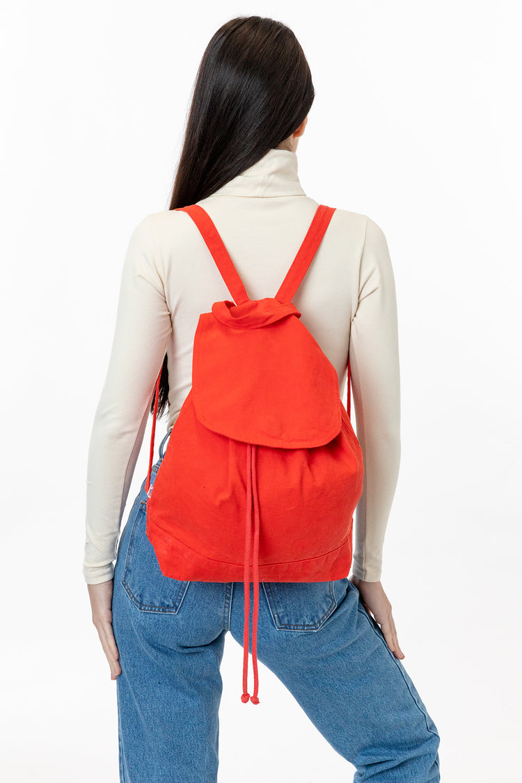 This garment-dyed, bull denim bag is a shrunken-down, medium-sized backpack for everyday use. It has a drawstring closure for the main compartment and the top flap has a button snap so your belongings are always secure. Our bags are made in our in house factory in Los Angeles, California by workers earning a living wag
