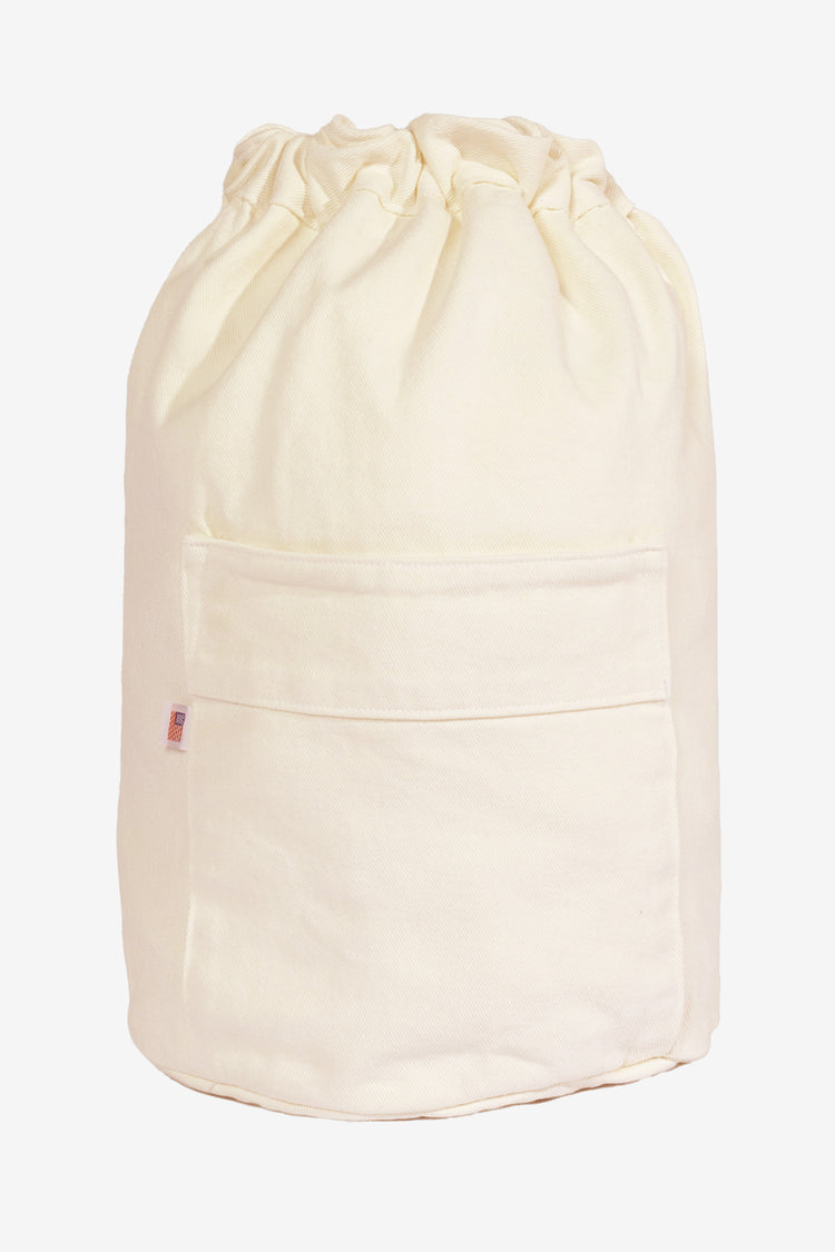 This garment-dyed, bull denim bag has a round-shaped bottom with plenty of height to fill with taller items. It is designed like a backpack with two straps that double also function as a drawstring to keep your belongings safe. We've also added a front pocket for easy access. Our bags are made in our in house factory i
