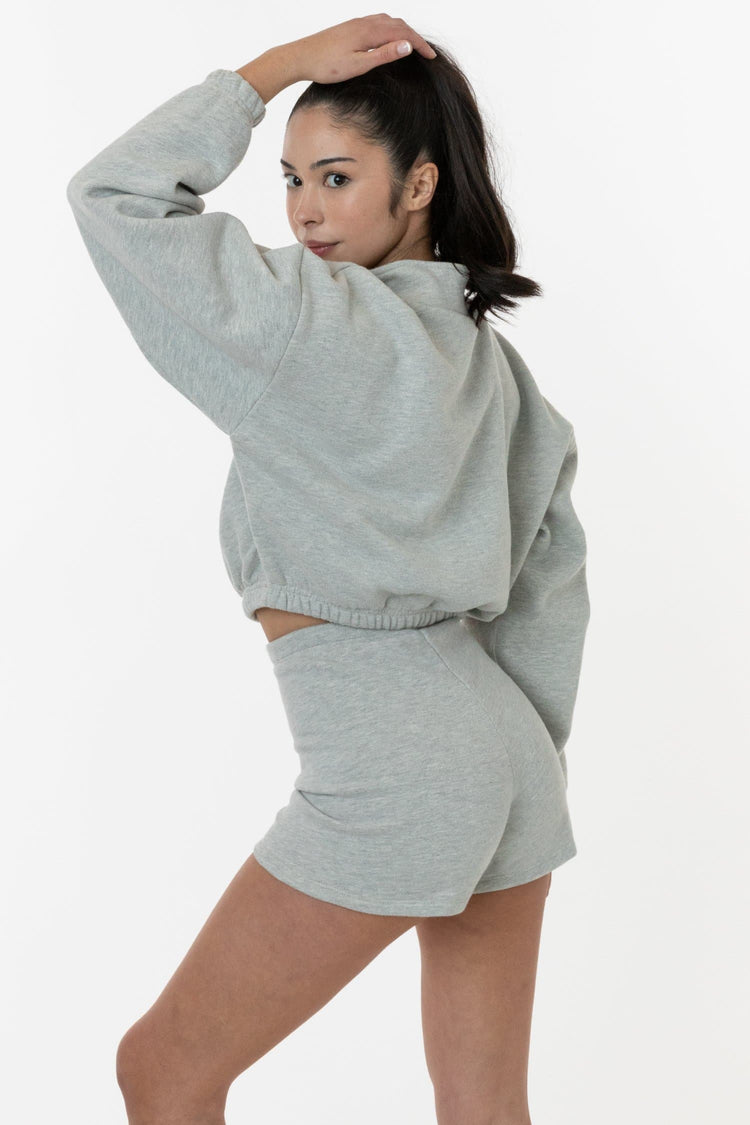 This fleece short is made with our 9 oz. heather cotton fleece and features a high waisted, fitted look. The 1 inch elastic waistband makes this style comfortable and easy to wear. Try pairing with a basic crop top and layer with our matching CF396 Cotton Fleece Half Zip for a full look. This style runs slightly large