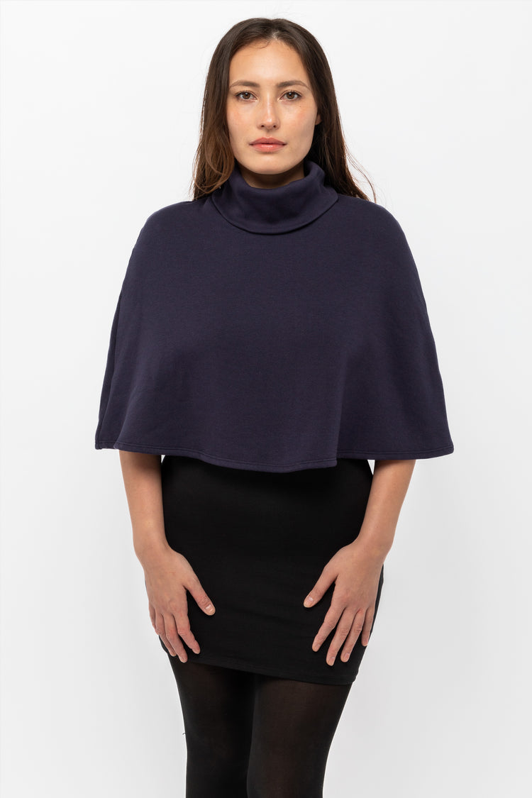 The Turtleneck Cape is made of a lightweight cotton polyester blend fleece with a smooth texture that provides ideal protection against the first signs of the autumnal chill. It’s a fun, versatile, and easy to layer sweatshirt cape that can be worn as a coverup on a night out or to the gym. *If you’re confused about ho