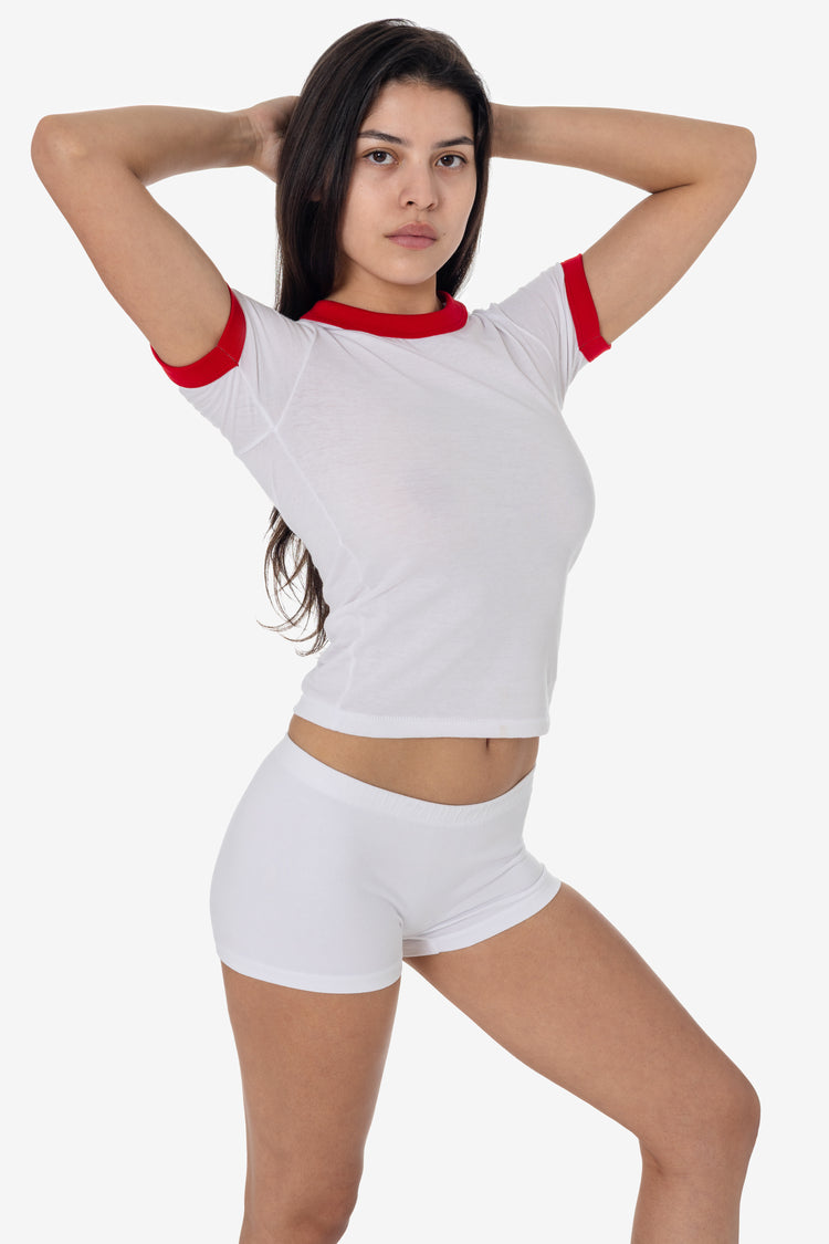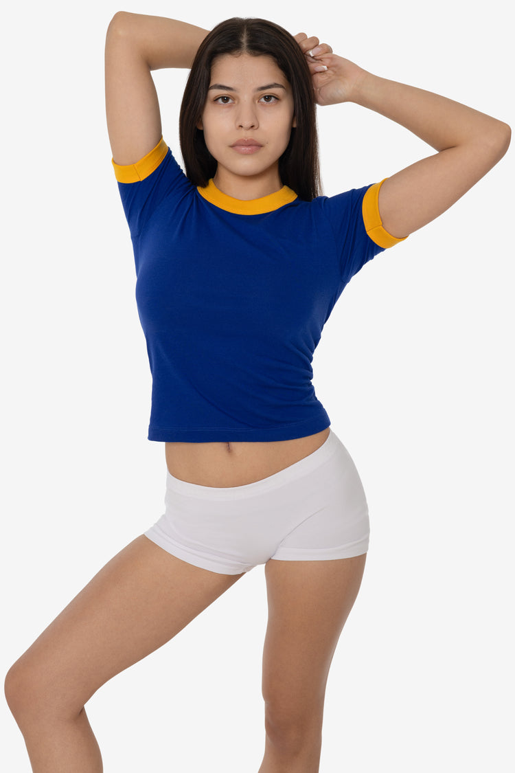 This women's ringer tee is crafted from our premium 50/50 Poly-Cotton blend, offering the perfect combination of comfort and durability. With a mid-length fit, this top features contrasting binding around the sleeves and neck for a classic look. Made in Los Angeles, California. Our skilled sewers earn up to $25 per hou