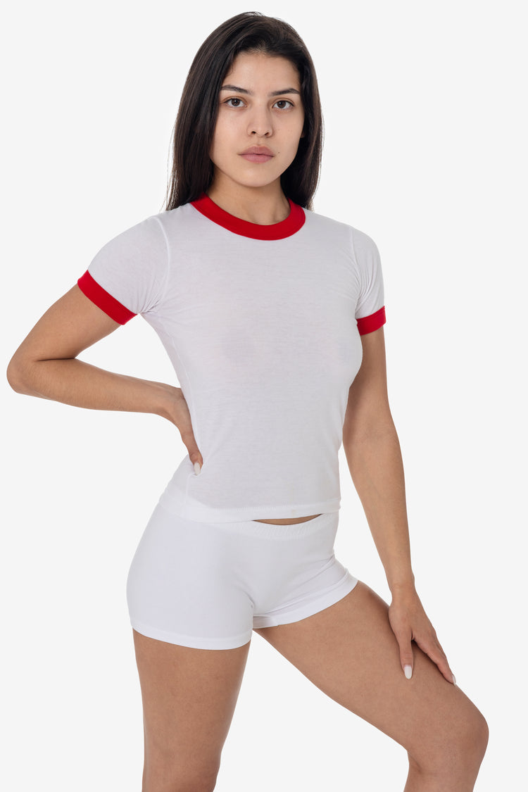 This women's ringer tee is crafted from our premium 50/50 Poly-Cotton blend, offering the perfect combination of comfort and durability. With a mid-length fit, this top features contrasting binding around the sleeves and neck for a classic look. Made in Los Angeles, California. Our skilled sewers earn up to $25 per hou