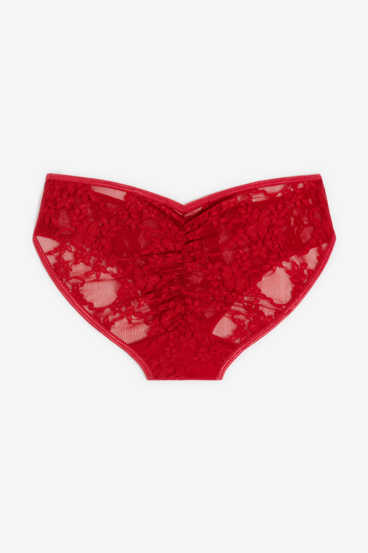 Our Floral Lace Ruched Back Bikini Panty is made of stretchy and durable nylon-spandex. These panties have a low cut leg and low rise fit with a heart-shaped, ruched back. Features foldover elastic binding for a secure fit and a cotton spandex gusset lining for hygienic comfort. Pair with our lace bralettes for a compl