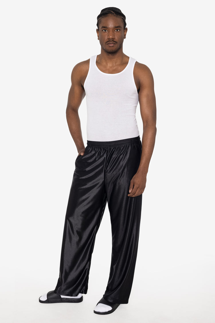 These Heavy Dazzle Training Pants are made of a durable polyester textile with an attractive, glossy sheen. Designed with a breezy, wide-fit and a gusseted inseam for flexibility and comfort. Features 2 side pockets, back pocket and an adjustable drawcord waist. Made in Los Angeles, Calif. Our experienced sewers earn u