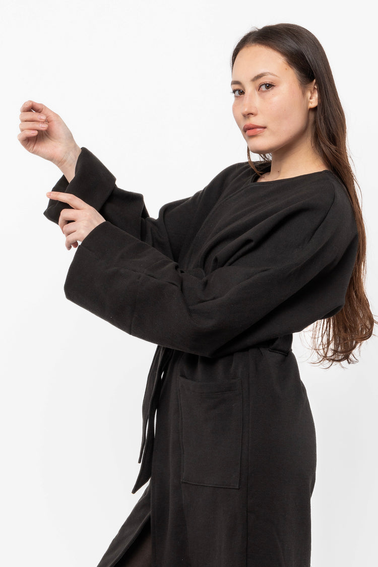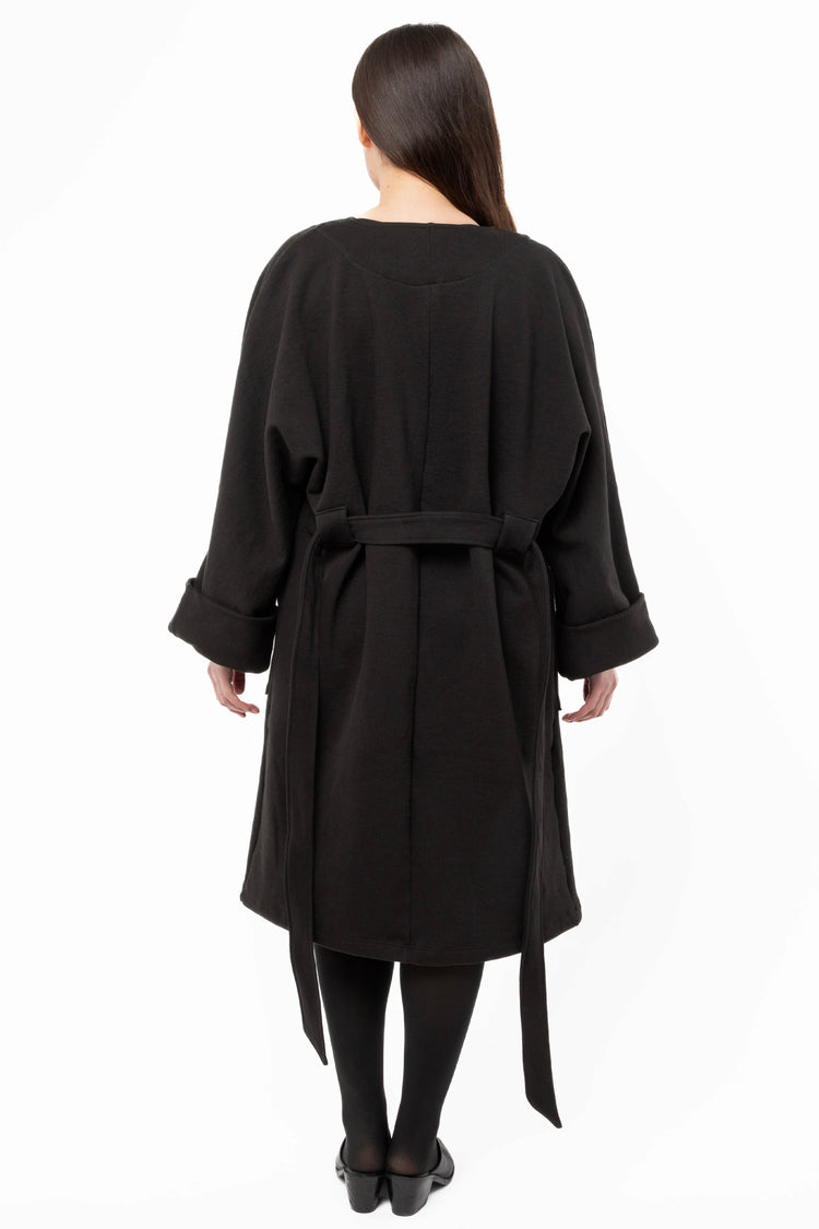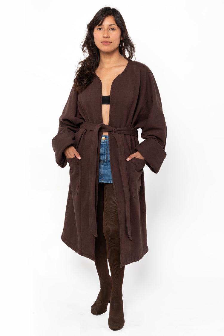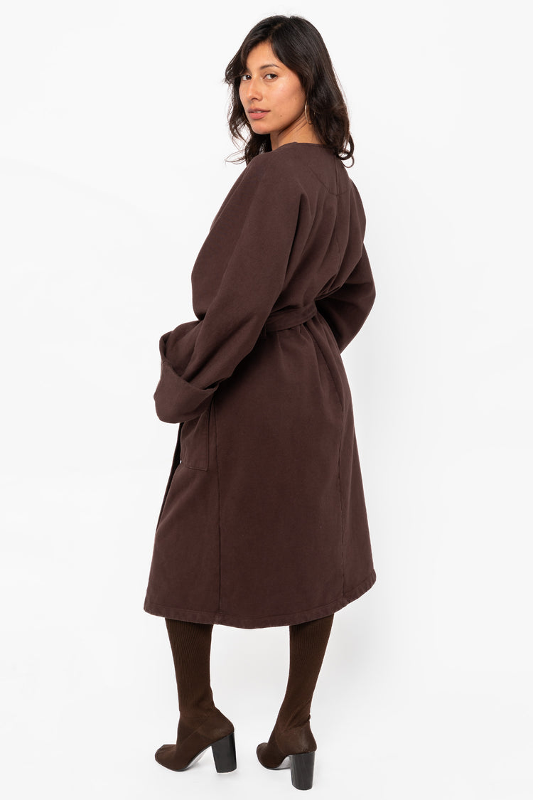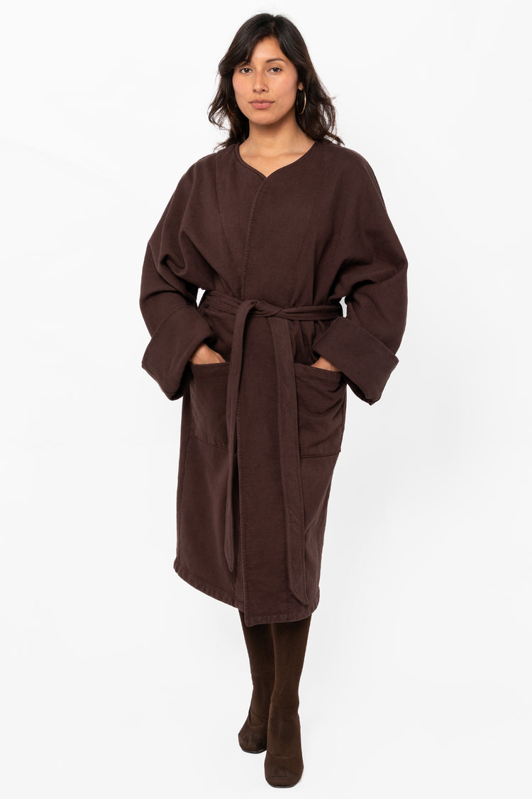 This garment dyed wrap coat is made of our heavy 14 oz. fleece, which we knit in house out of US grown cotton. Large patch pockets provide ample storage space and the sleeves can be worn cuffed or long. While this coat is made of cotton fleece, it looks and feels polished enough to elevate any outfit. This coat can be