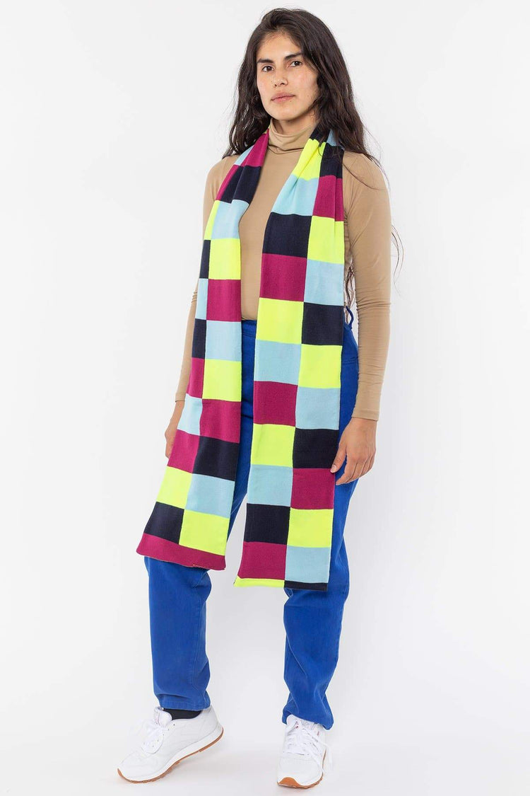 The reversible Bauhaus inspired scarf has a different color block design on each side. Simply turn it over for a whole new look on color theory. Artwork designed by Kchungstudio • 95" Long• Made in Los Angeles, Calif.• Reversible• Unisex• 100% Acrylic