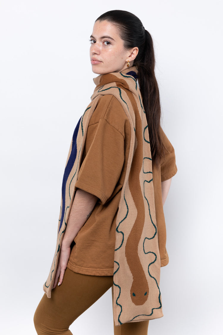 A scarf with two intertwining serpents. The serpent is a symbol found in many ancient cultures, representing a broad spectrum of ideas as diverse as fertility, rebirth, immortality, and of course, Eve’s original seduction. From Mesoamerica, Ancient Greece, Ancient Egypt, Buddhism, and Britney’s shoulder’s (and many mor