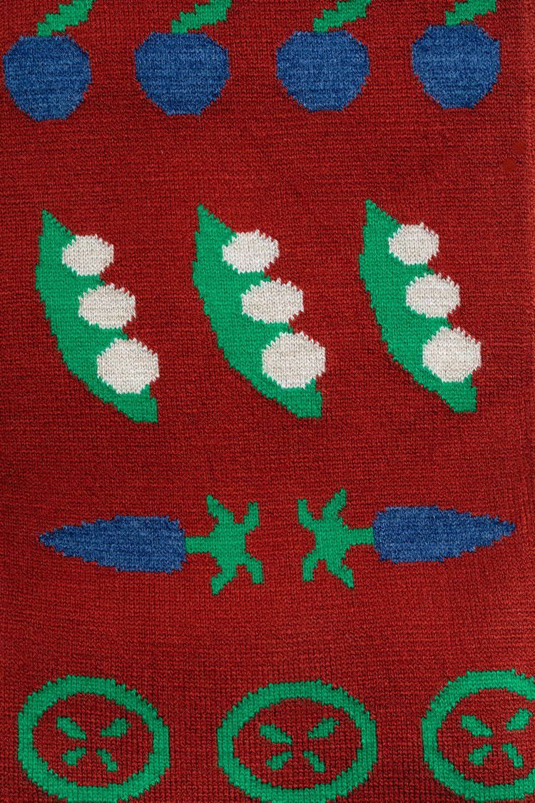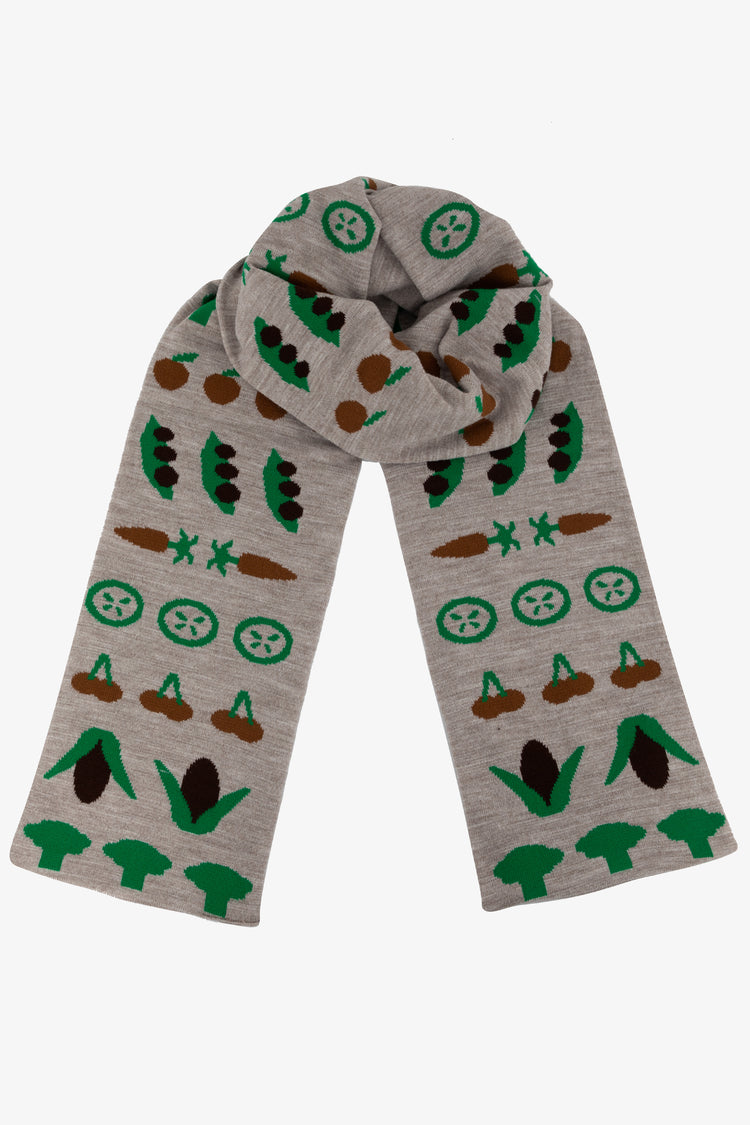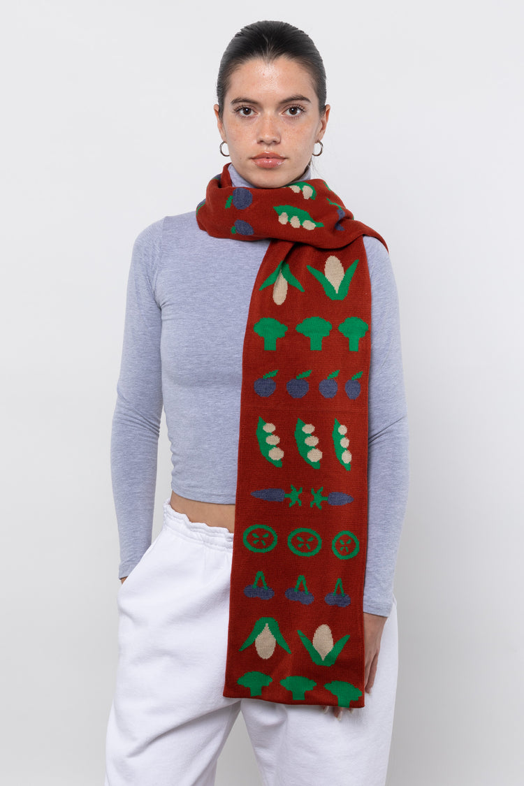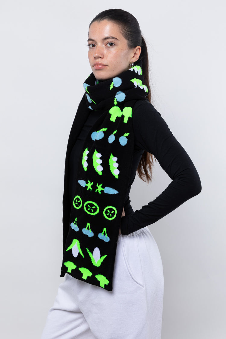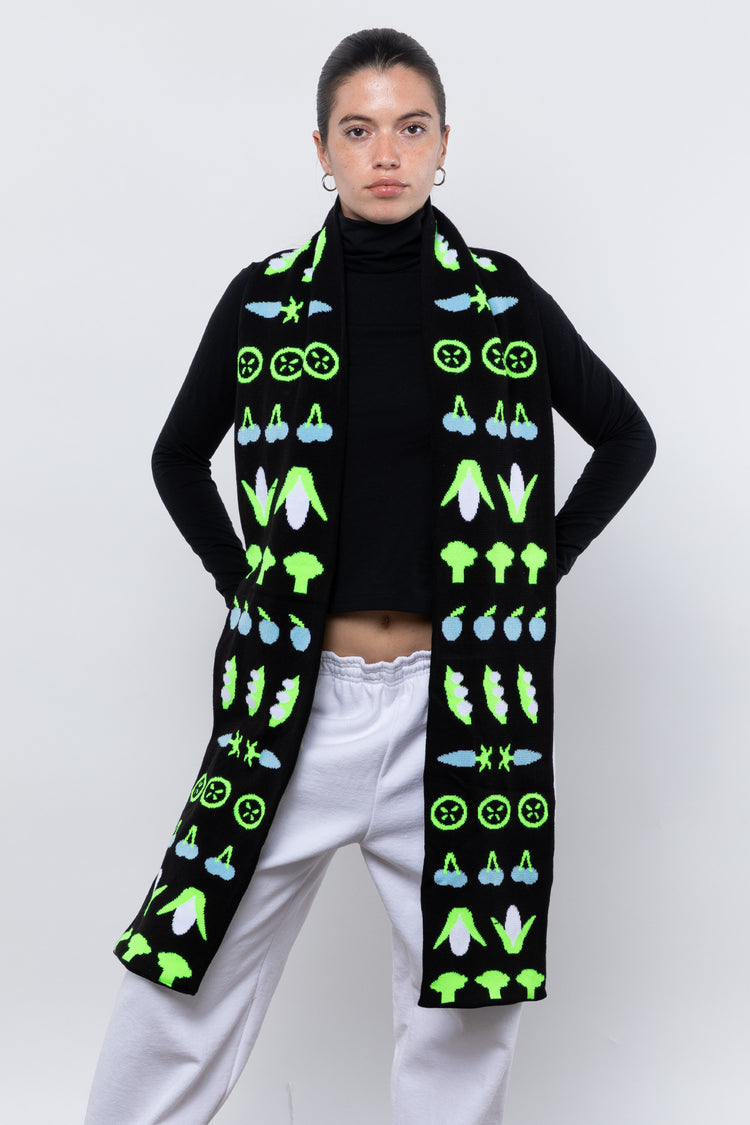 A nutritious scarf with a plentiful melange of fruits and vegetables. Artwork by KChung Studio. • 95" Long• Made in Los Angeles, Calif.• Unisex• 100% Acrylic