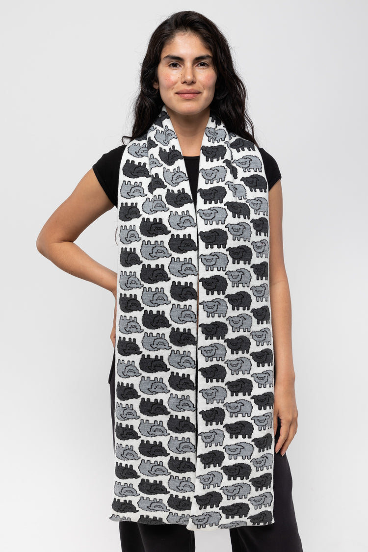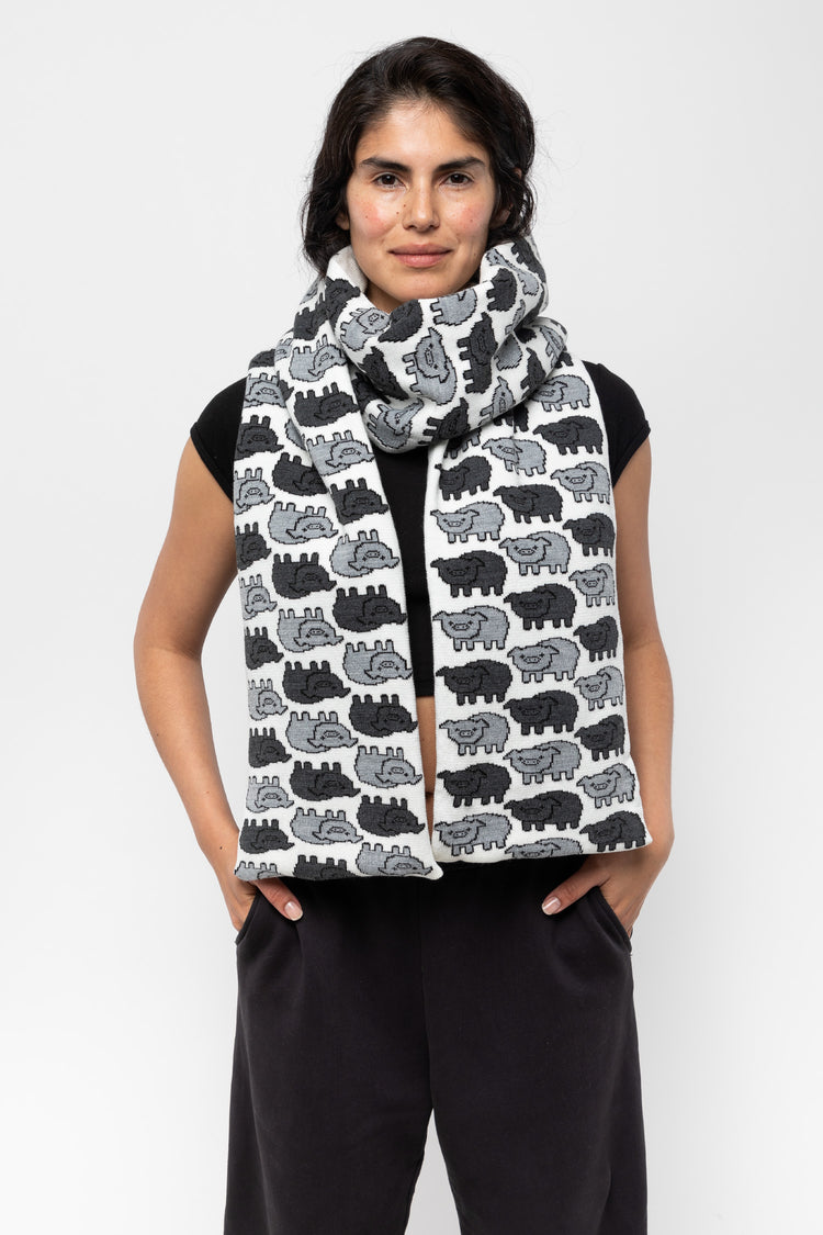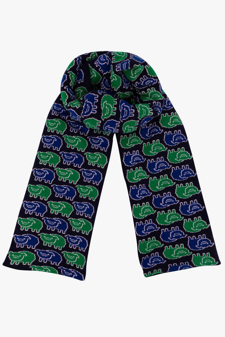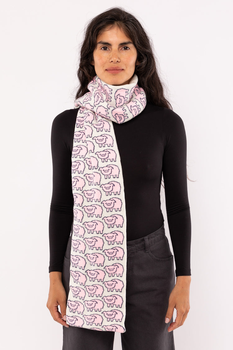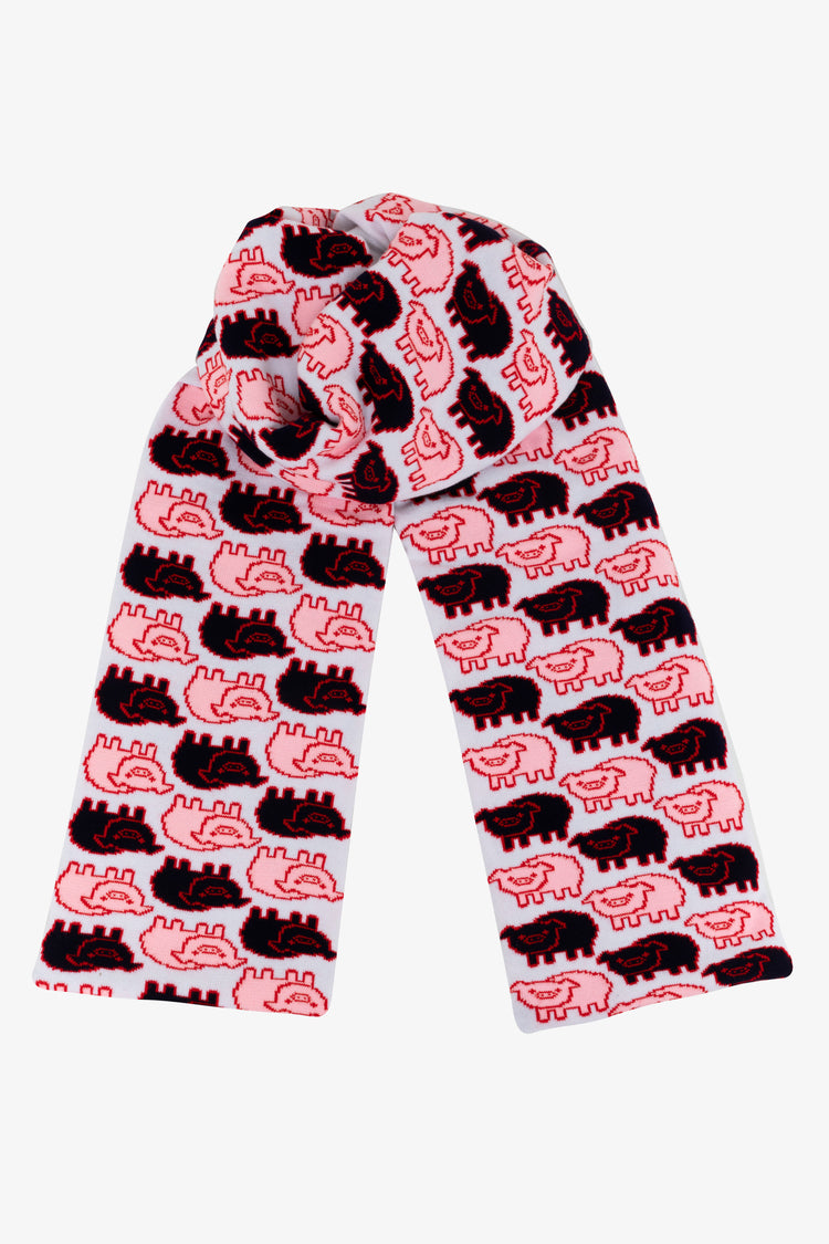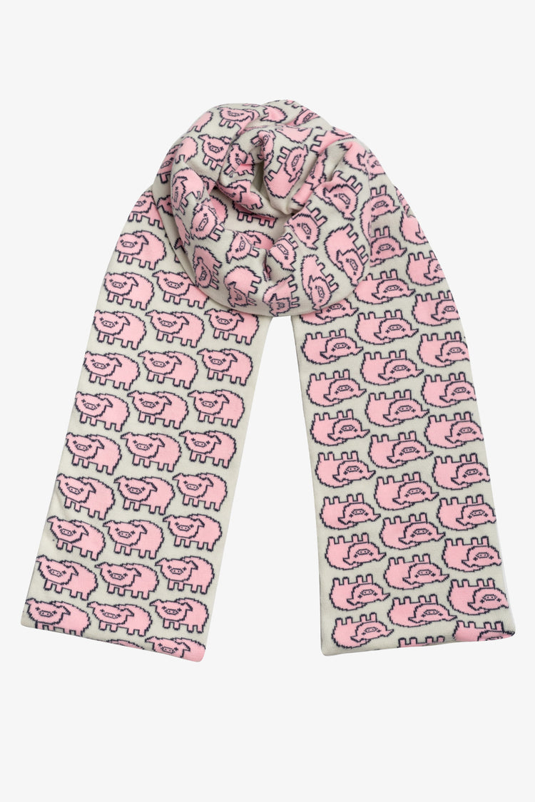 This scarf features a cute repeating piggy pattern. Artwork designed by Kchungstudio • 95" Long• Made in Los Angeles, Calif.• Unisex• 100% Acrylic