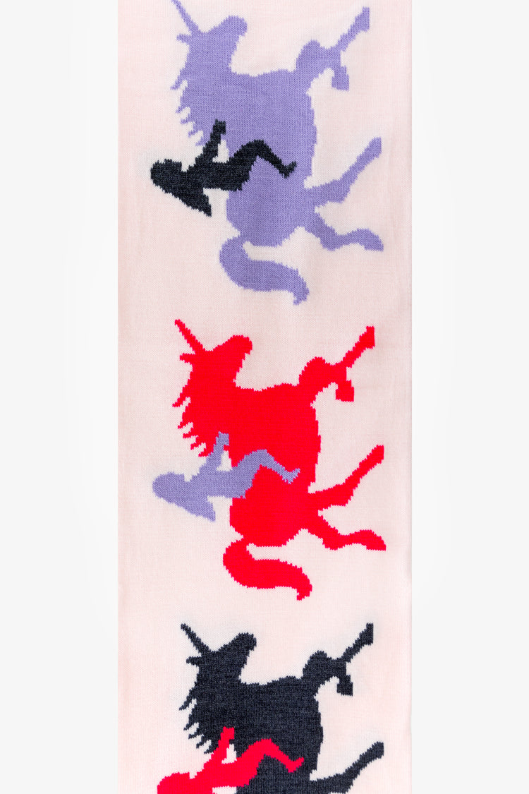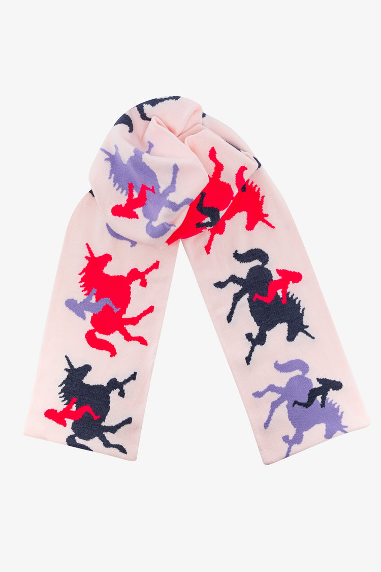 This scarf features multicolored silhouettes of unicorns with a mysterious rider galloping into the distance. • Approximately 77" Long• Made in Los Angeles, Calif.• Unisex• 100% Acrylic