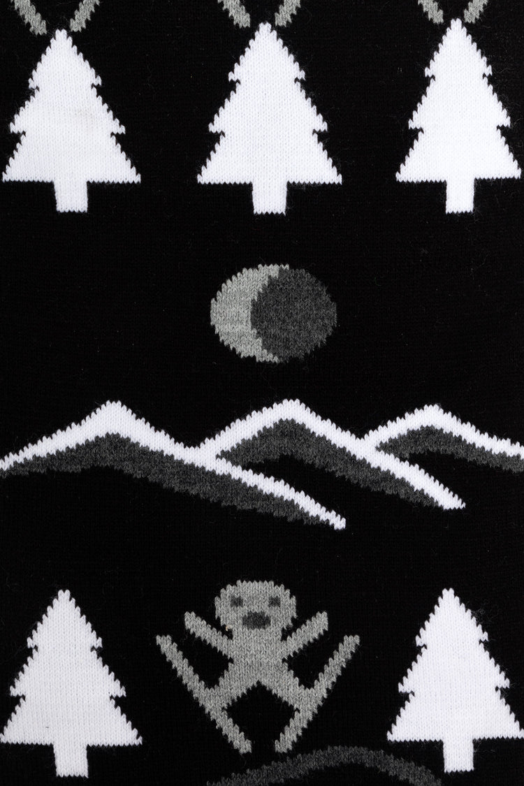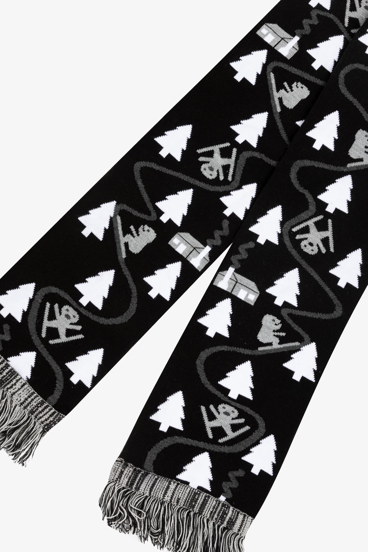 This scarf features a narrative snow capped mountain landscape. Will our hero make it down the slopes in the dark of the night with only the moonlight to illuminate their way? Artwork by KChung Studio • 95" Long• Made in Los Angeles, Calif.• Reversible• Unisex • 100% Acrylic