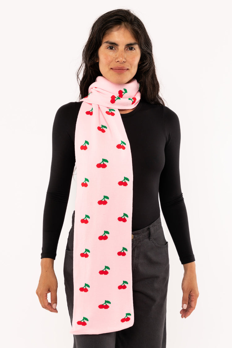 We knit this scarf with cutest all over cherry pattern to sweeten up your day. Artwork designed by KChungStudio. • 100% Acrylic • 95” Long • Unisex • Made in Los Angeles, Calif.